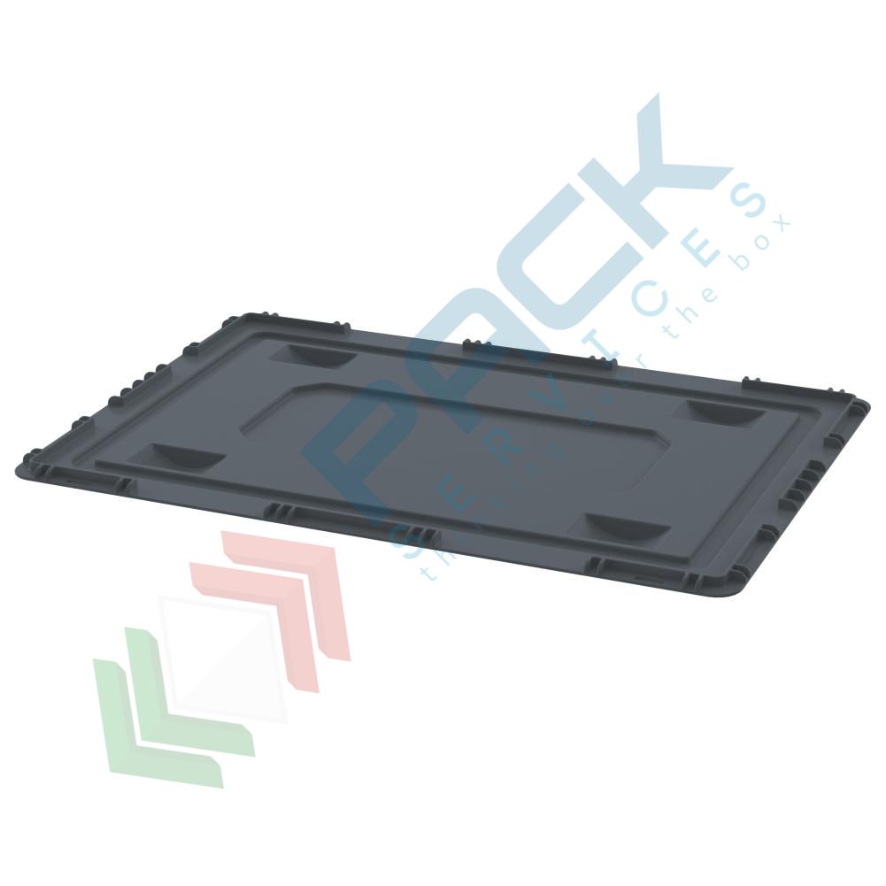 Coperchio d'appoggio per cassetta in plastica sovrapponibile Norma Europa Mis. 600 L x 400 P x 10 H mm, realizzato in PP (Polipropilene). Coperchio in plastica per cassetta NON idonea al contatto con alimenti. Colore grigio scuro.
