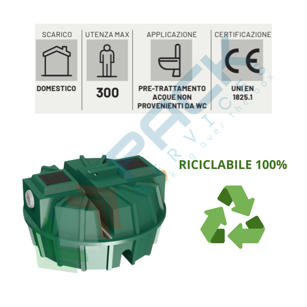 Degrassatore realizzato in polietilene monoblocco completo di chiusini quadrati per ispezione camera principale, ispezione camera laterale e prelievo residui galleggianti o sedimentabili. Dotato di sifone intermedio di passaggio tra la prima e la seconda camera. Completo di tronchetto di entrata in PVC, tronchetto di uscita in PVC con guarnizione in EPDM e deflettore a T in uscita; allestito con nervature perimetrali verticali profonde e nervature di irrigidimento orizzontali profonde; impiego da 5 a 300 Abitanti Equivalenti o da 5 a 1.100 coperti.