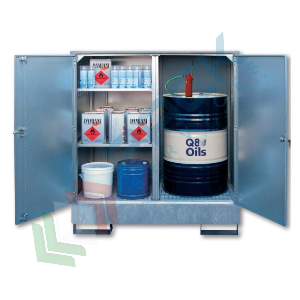 Armadio di stoccaggio per 1 fusto da 200 kg in verticale, barattoli su ripiani estraibili su telaio fisso, realizzato in acciaio zincato, Mis. 1550 L x 900 P x 1660 H mm. Armadio in acciaio al carbonio zincato, doppia anta a battente, tetto fisso. Vasca di contenimento realizzata in acciaio al carbonio spessore 2 mm, allestito con rinforzi strutturali. Saldatura a controllo elettronico. La vasca di raccolta è stata sottoposta a verifica di collaudo con prova idraulica effettuata a pieno carico sulle 48 ore consecutive a pressione atmosferica e temperatura ambiente con esito positivo e quindi è a tenuta stagna. Passaggio forche per sollevamento tramite carrello elevatore. Deposito di stoccaggio con capacità 267 Litri.