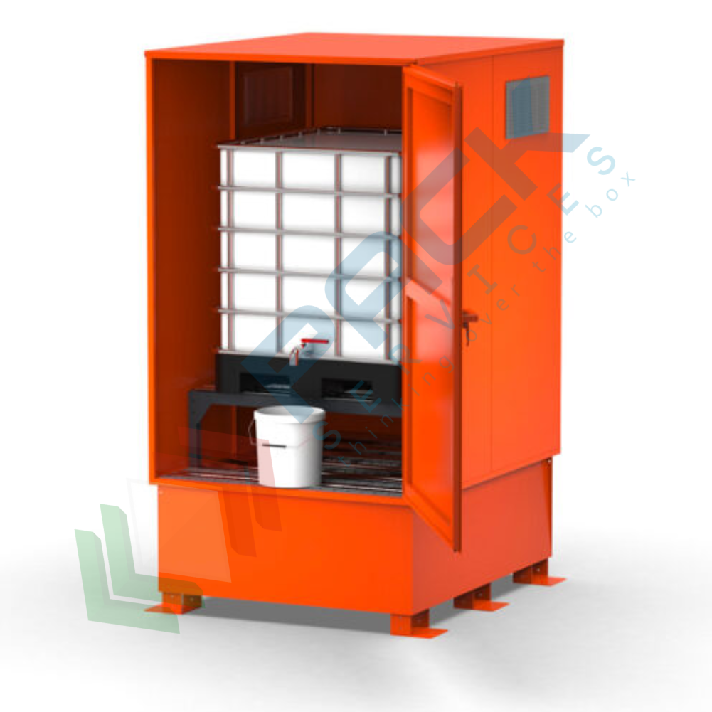 Armadio di contenimento per lo stoccaggio di sostanze pericolose ed infiammabili adatto per lo stoccaggio di 1 cisterna 1000 Lt, dotato di vasca di contenimento con capacità di 1000 litri, ante richiudibili e tetto fisso per facilitare le operazioni di stoccaggio dei fusti. Il deposito di stoccaggio presenta Mis. 1360 L x 1665 P x 2600 H mm, ed è la soluzione ideale e sicura per l’organizzazione di aree di deposito per cisterne IBC. Armadio di stoccaggio per 1 ibc 1000 Lt che viene utilizzato per prevenire eventuali sversamenti di sostanze pericolose ed inquinanti negli ambienti di lavoro o all'interno di falde acquifere. Colore arancio RAL 2004.