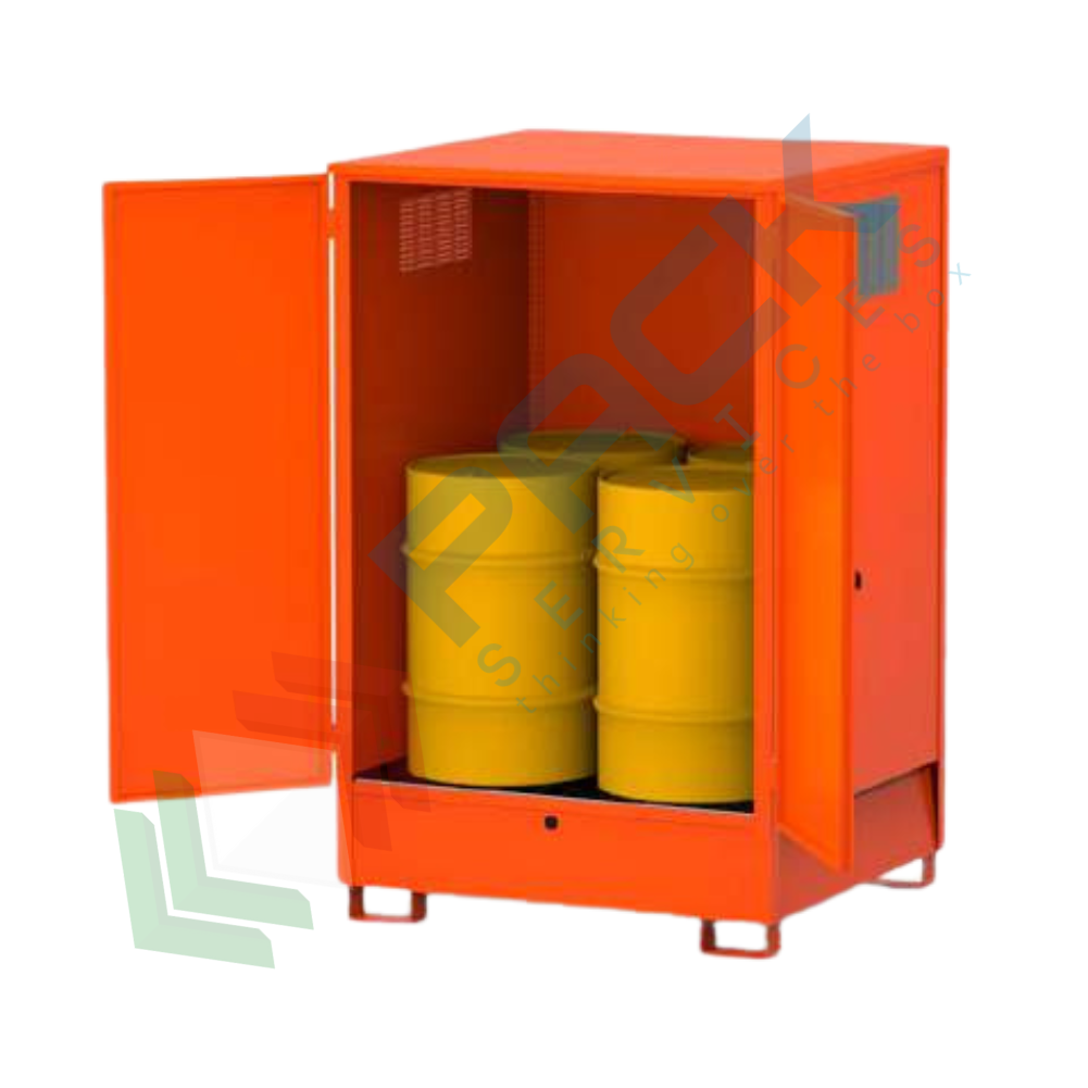 Armadio di contenimento per lo stoccaggio di sostanze pericolose ed infiammabili adatto per lo stoccaggio di quattro fusti olio 200 Lt, dotato di vasca di contenimento con capacità di 300 litri, ante richiudibili e tetto fisso per facilitare le operazioni di stoccaggio dei fusti. Il deposito di stoccaggio presenta Mis. 1310 L x 1210 P x 2100 H mm, ed è la soluzione ideale e sicura per l’organizzazione di aree di deposito per fusti. Armadio di stoccaggio per fusti olio 200 Lt che viene utilizzato per prevenire eventuali sversamenti di sostanze pericolose ed inquinanti negli ambienti di lavoro o all'interno di falde acquifere. Colore arancio RAL 2004.