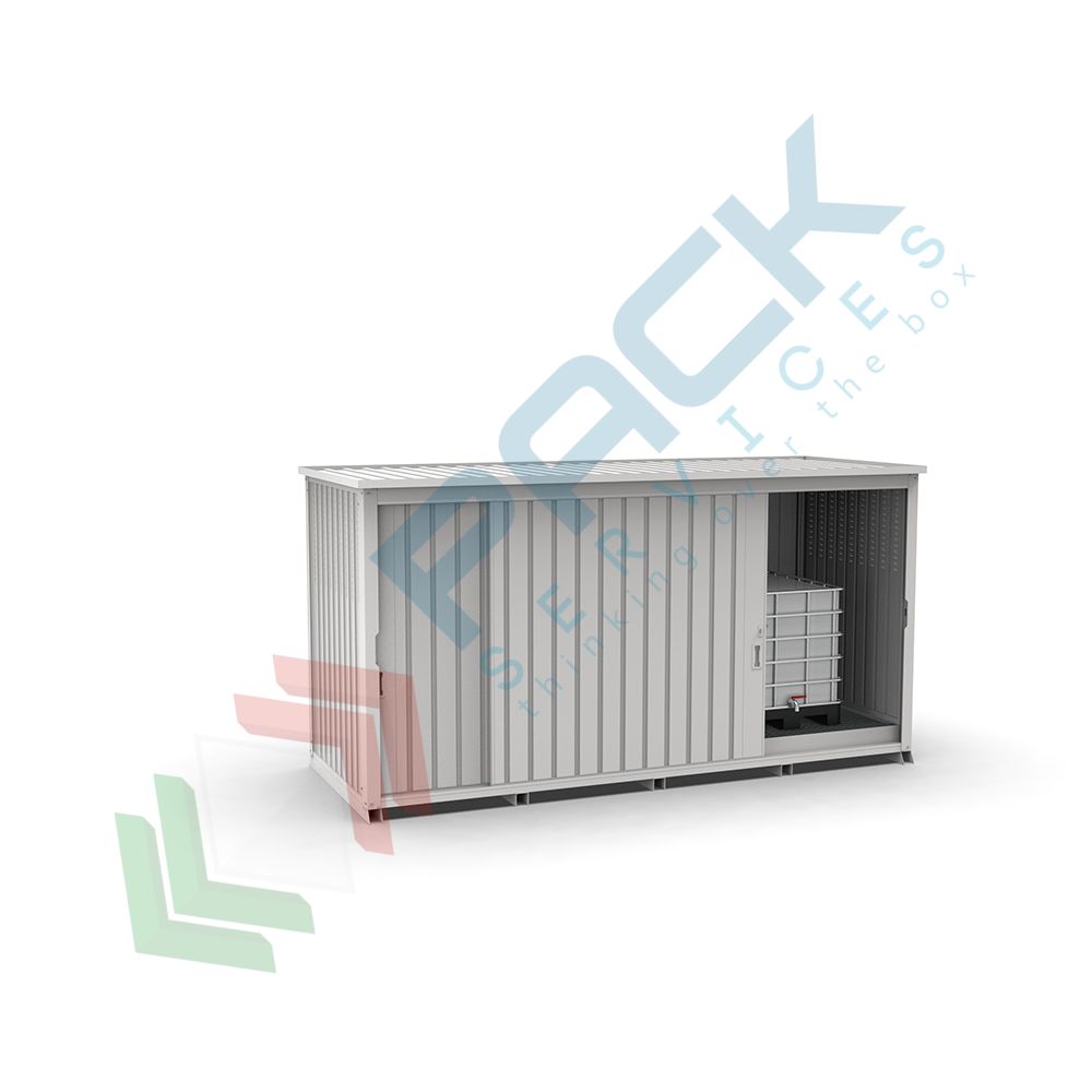 Deposito lineare con porta scorrevole per lo stoccaggio esterno di 4 IBC, con vasca di contenimento 1600 Lt