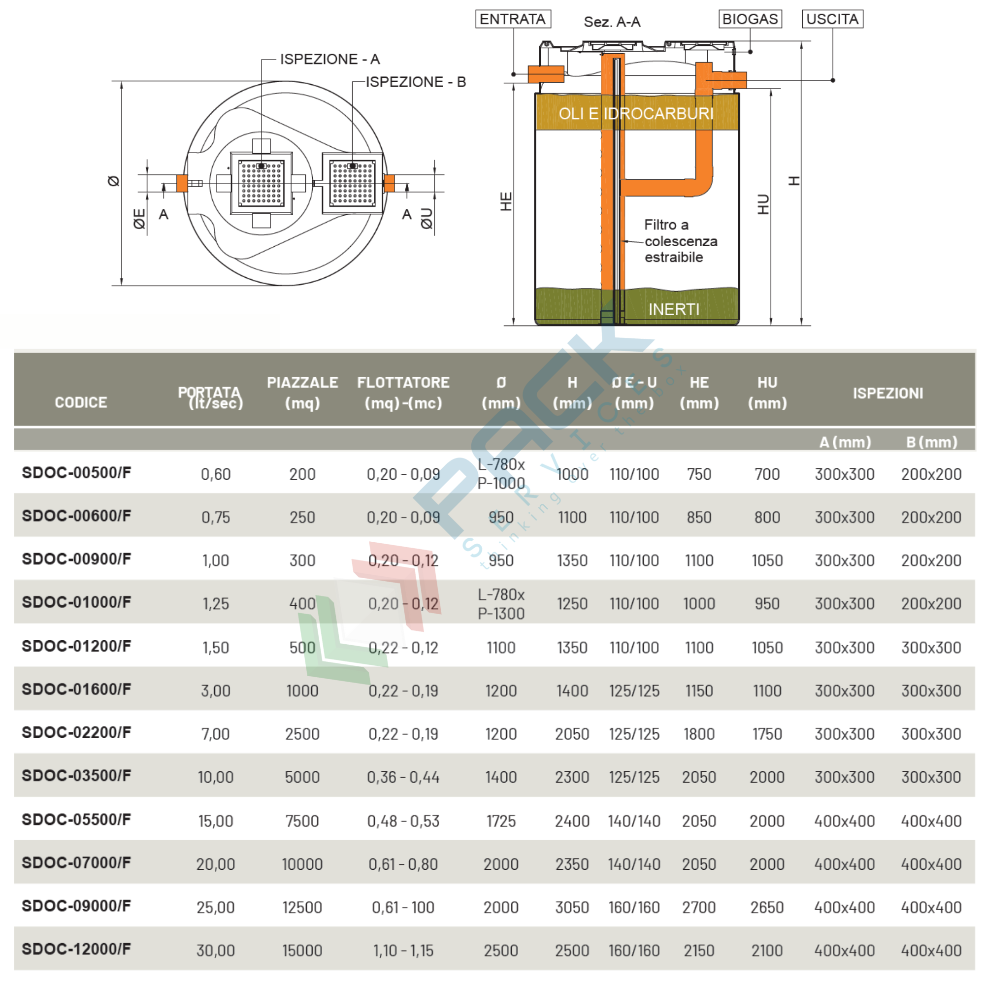 Separatore di oli a coalescenza con filtro estraibile, mis. Ø 950 x H 1350 mm, capacità 900 Lt, idoneo per il trattamento delle acque di lavaggio di superfici coperte e/o scoperte con presenza di materiale sedimentabile, oli minerali ed idrocarburi confluenti nel collettore fognario. Realizzato in polietilene lineare (PE) mediante lo stampaggio rotazionale. Contenitore e sedimentatore monolitici stampati in un unico pezzo senza giunzioni. La gamma è prodotta in conformità e in ottemperanza del Regolamento UE 305/11 inerente ai prodotti da costruzione e della Direttiva Europea 2004/108/EC, nel rispetto della Norma Armonizzata UNI EN 858-1 per deoliatori di classe I e rispondono alle richieste del D.Lgs. 152/2006 e successive modifiche.