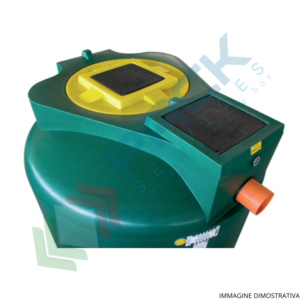 Separatore di oli per gravità, mis. Ø 1300 x 1250 H mm, capacità 1000 Lt, idoneo per il trattamento delle acque di lavaggio di superfici coperte e/o scoperte con presenza di materiale sedimentabile, oli minerali ed idrocarburi confluenti nel collettore fognario. Realizzati in polietilene lineare (PE) mediante lo stampaggio rotazionale. Contenitore e sedimentatore monolitici stampati in un unico pezzo senza giunzioni. La gamma è prodotta in conformità e in ottemperanza del Regolamento UE 305/11 inerente ai prodotti da costruzione e della Direttiva Europea 2004/108/EC, nel rispetto della Norma Armonizzata UNI EN 858-1 per deoliatori di classe II e rispondono alle richieste del D.Lgs. 152/2006 e successive modifiche.