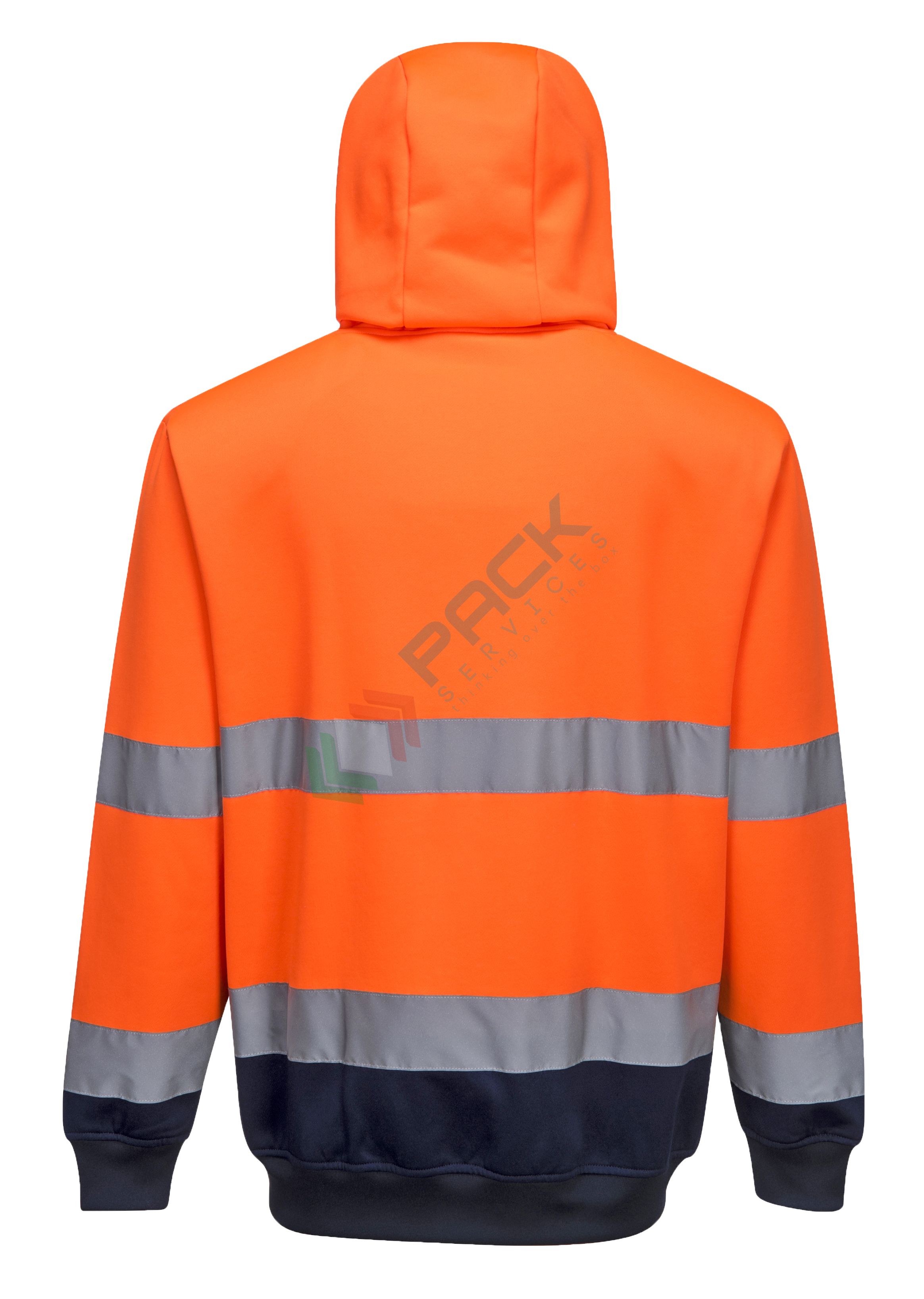 Felpa alta visibilità con cappuccio, 65% poliestere + 35% cotone, 300 gr, chiusura con zip, omologata EN ISO 20471, colore arancione + blu navy