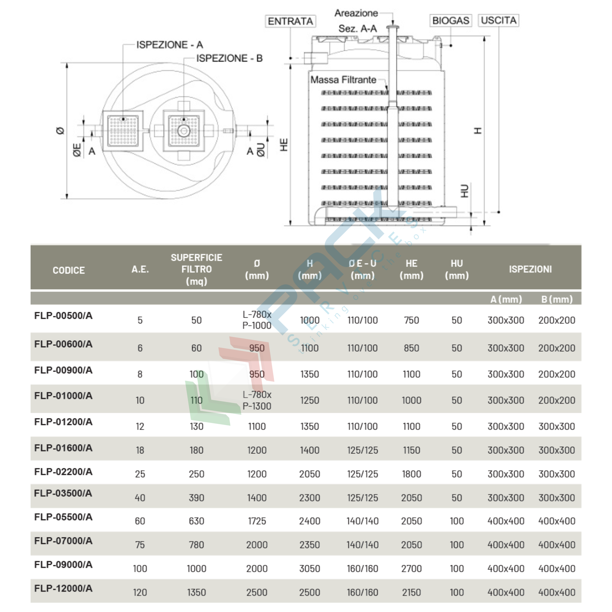Filtro percolatore aerobico, A.E. 12, capacità 1200 Lt, Mis. Ø 1100 x 1350 H mm, per il trattamento secondario dei reflui domestici