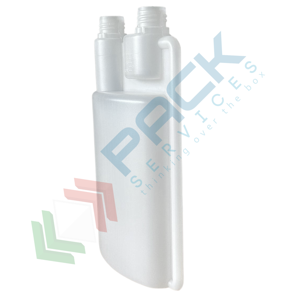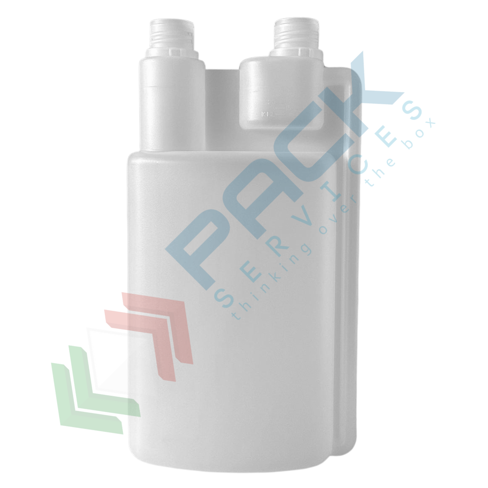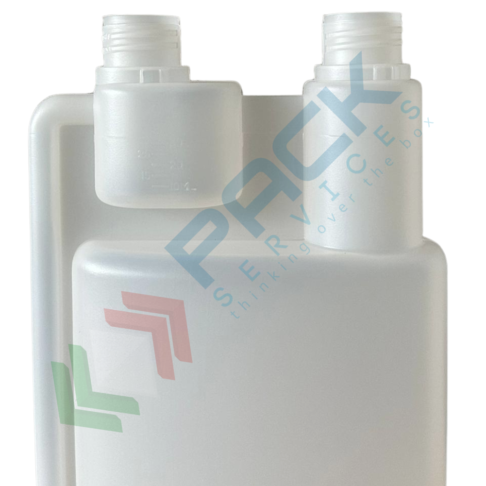 Flacone in plastica (HDPE) rettangolare a collo stretto con dosatore a due tappi, capacità 1000 ml, chiusura con tappo a vite con apertura del sigillo a strappo (tappi esclusi), colore neutro