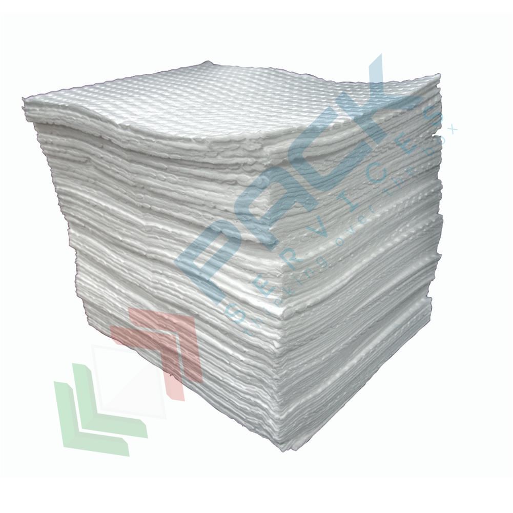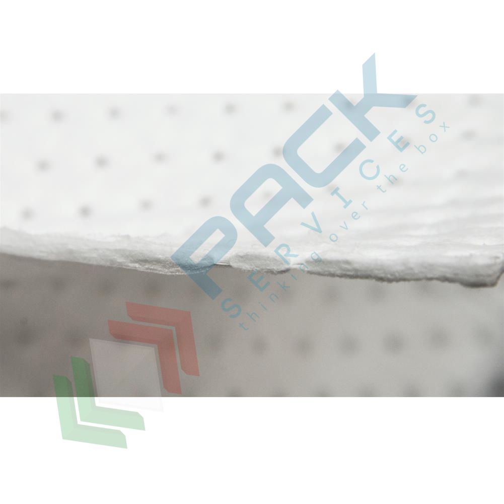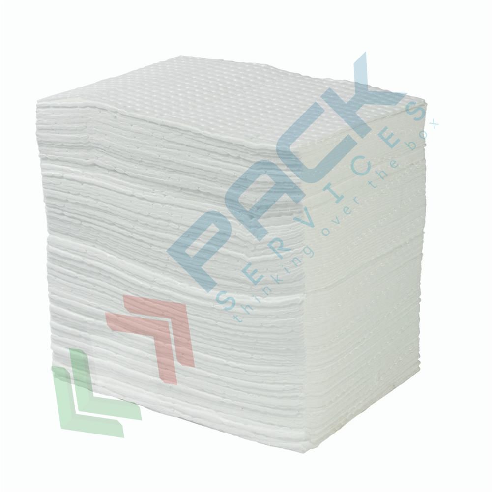 Panni assorbenti idrofobi per olio e idrocarburi, versione rinforzata e pretagliata ad ultrasuoni, Mis. 50 x 40 cm, confezione da 100 fogli. Fogli assorbenti con capacità di assorbimento 1.250 ml./foglio - 125 lt./conf. I fogli assorbenti rinforzati vengono realizzati tramite una saldatura ad ultrasuoni che crea una struttura costituita da due strati esterni di polipropilene detto "fine fiber" che avvolgono completamente uno spesso strato (gr/mq 350) di tessuto assorbente (melt blown). I tre strati saldati ad ultrasuoni impediscono la perdita di fibre e conferiscono una notevole resistenza all’abrasione. I fogli assorbenti sono molto resistenti e robusti, rappresentano lo standard industriale per rapporto qualità/resa e sono considerati i migliori in commercio in quanto possiedono la maggior capacità assorbente dei prodotti della loro categoria. Altissima resistenza allo strappo ed alla pressione anche a completo assorbimento, assenza totale di fibre sulla superficie. I fogli assorbitori possono essere collocati su corsie ad intenso traffico, a lato di macchine utensili e su banchi di lavoro e si possono posare pezzi unti di olio o di grasso senza che a questi si attacchino delle fibre. Versaliti poichè pretagliati, in modo da minimizzare gli sprechi, utilizzando solo la quantità necessaria.