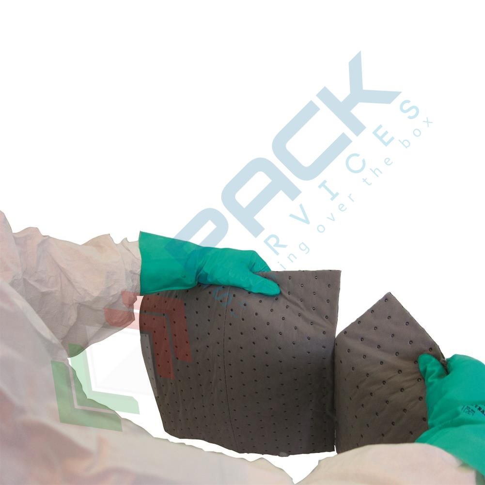 Impiego: Adagiare i panni sopra gli sversamenti di liquidi, in brevissimo tempo assorbono fino a saturazione. Adatti per un impiego preventivo in luoghi di potenziali perdite(attorno ai macchinari, in luoghi di difficile accesso, sui banchi di lavoro, ecc.). Sono pretagliati longitudinalmente per poter adoperare solo il prodotto necessario senza sprechi.