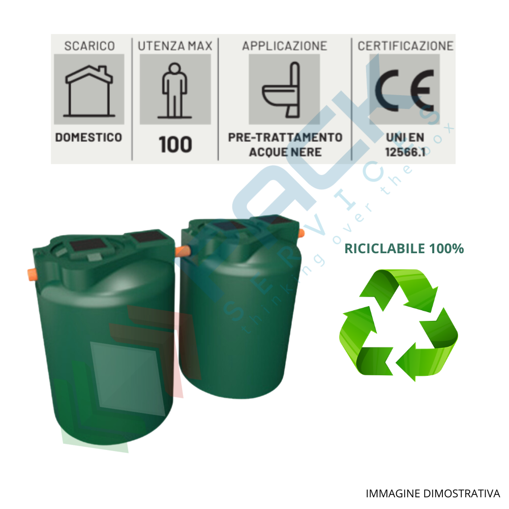 NORMATIVA DI RIFERIMENTO: La gamma è prodotta in conformità e in ottemperanza del regolamento UE 305/11 inerente ai prodotti da costruzione e della Direttiva Europea 2004/108/EC, nel rispetto della Norma Armonizzata UNI EN 12566-1, risponde alle indicazioni della Tab.3 dell’Allegato 5 del D.Lgs. 152/2006 e successive modifiche e conforme alle indicazioni dettate dal Comitato dei Ministri per la tutela delle acque dall’inquinamento.