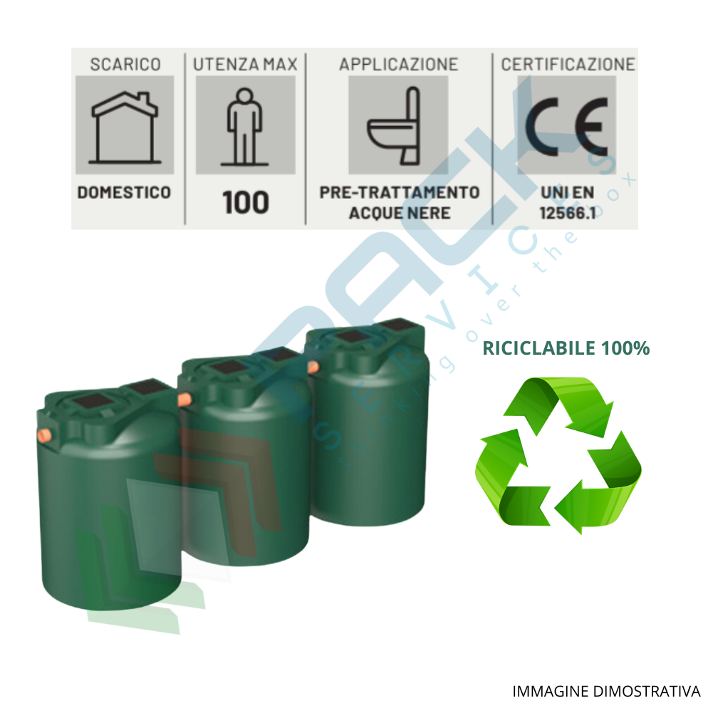 NORMATIVA DI RIFERIMENTO: La gamma è prodotta in conformità e in ottemperanza del regolamento UE 305/11 inerente ai prodotti da costruzione e della Direttiva Europea 2004/108/EC, nel rispetto della Norma Armonizzata UNI EN 12566-1, risponde alle indicazioni della Tab.3 dell’Allegato 5 del D.Lgs. 152/2006 e successive modifiche e conforme alle indicazioni dettate dal Comitato dei Ministri per la tutela delle acque dall’inquinamento.