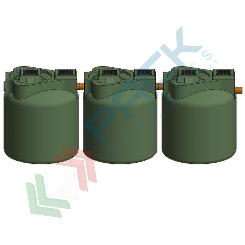 Fossa settica tricamerale, A.E. 8, mis. Ø 2850 x H 1350 mm, capacità 900 Lt. Fossa bicamerale indicata per il trattamento primario dei reflui domestici in generale delle acque miste (nere e grigie) confluenti nel collettore fognario. Può essere utilizzata in ogni caso laddove sia espressamente indicato l’uso di una fossa settica. Contenitore cilindrico verticale liscio con fondo piano, realizzato in polietilene lineare mediante lo stampaggio rotazionale; Monolitico ovvero stampato in un unico pezzo senza giunzioni. È equipaggiato di ispezioni corredate da coperchio a base quadrata pedonabile, tronchetto di uscita in PVC, tubazione d’ingresso in PP, guarnizione in EPDM sulla tubazione d’uscita, guarnizione in EPDM predisposta per il collegamento della tubazione per il biogas (non compresa nella fornitura).