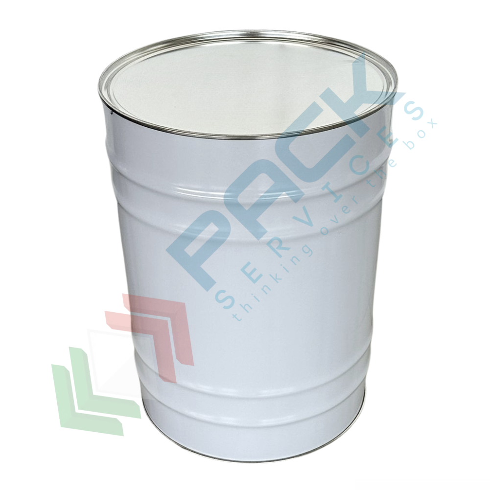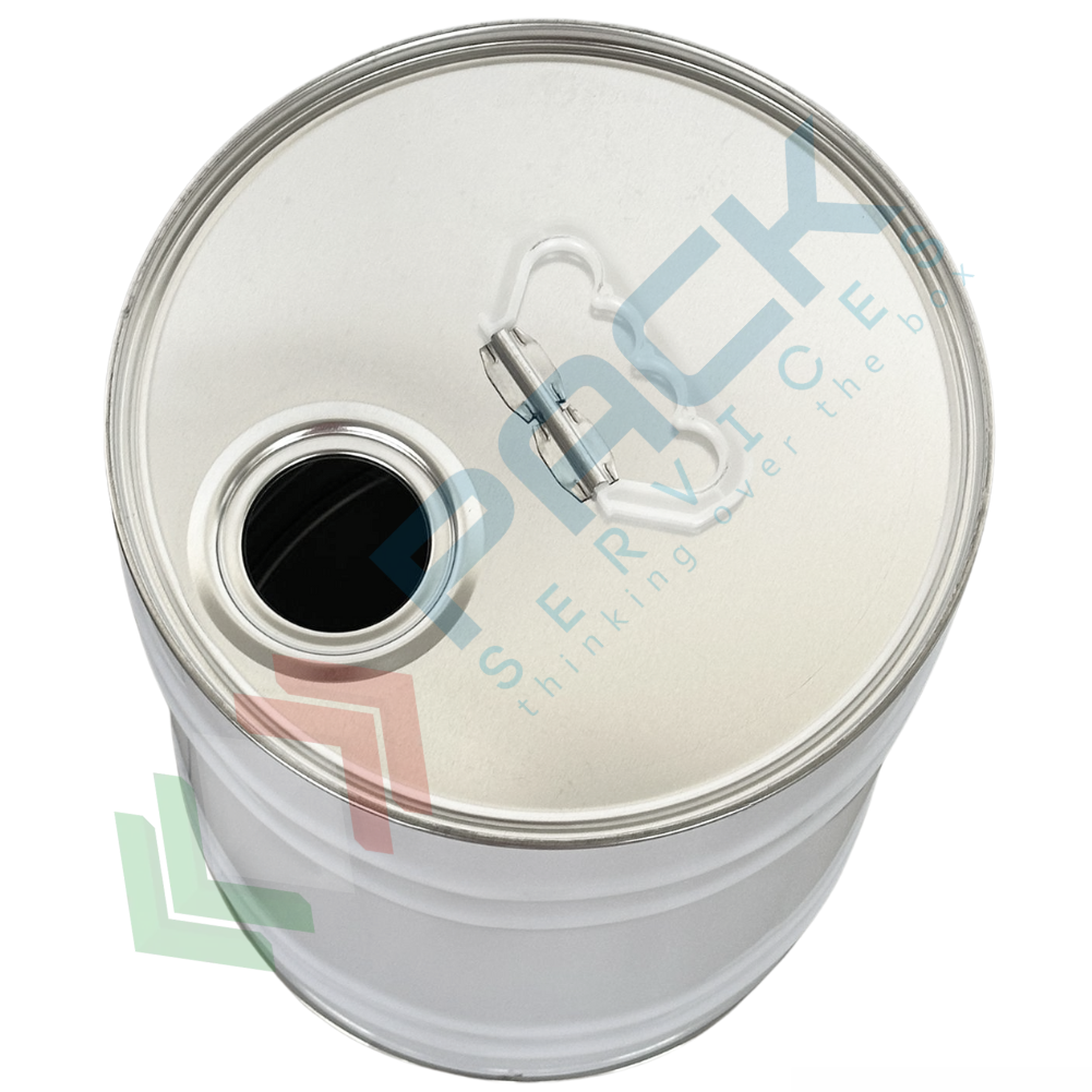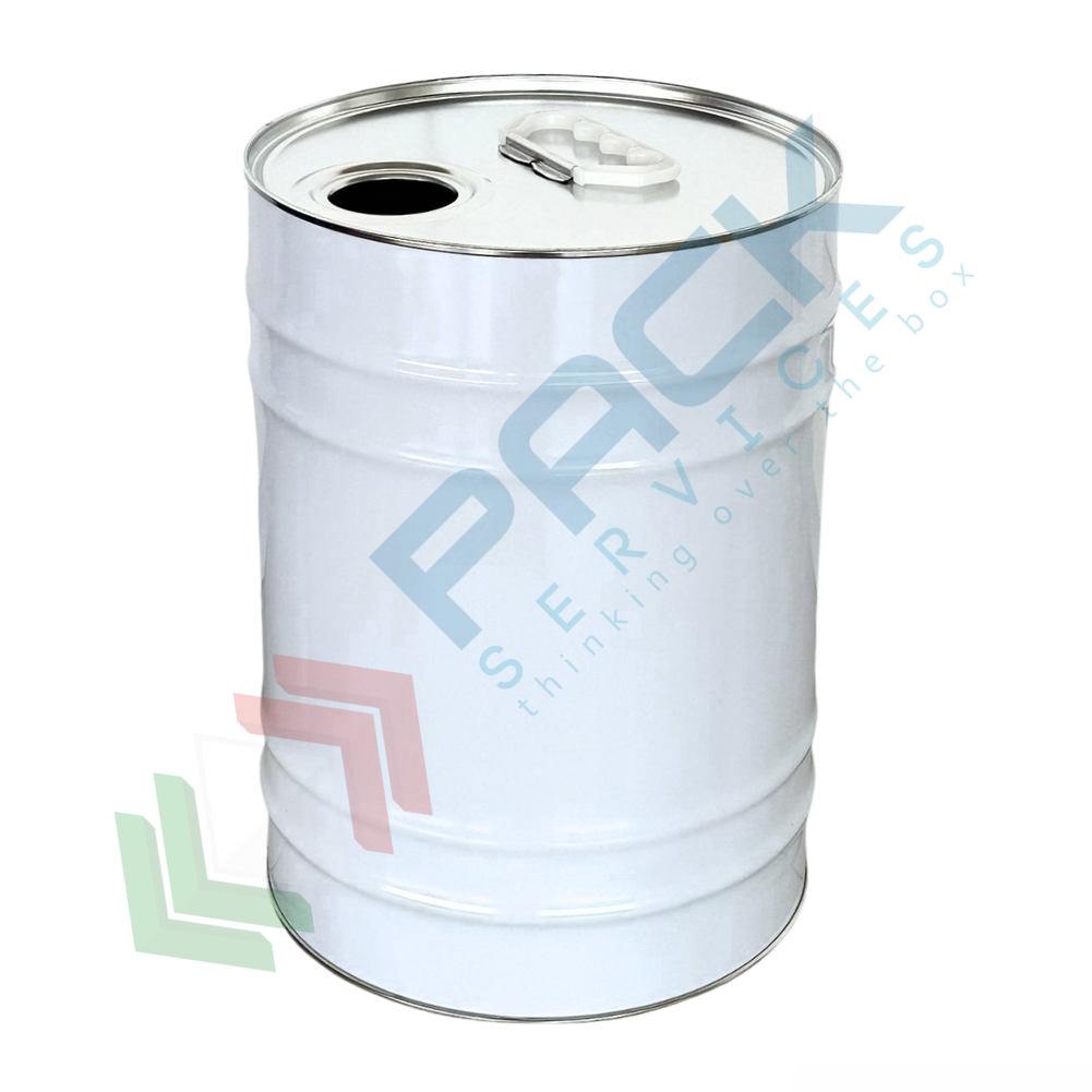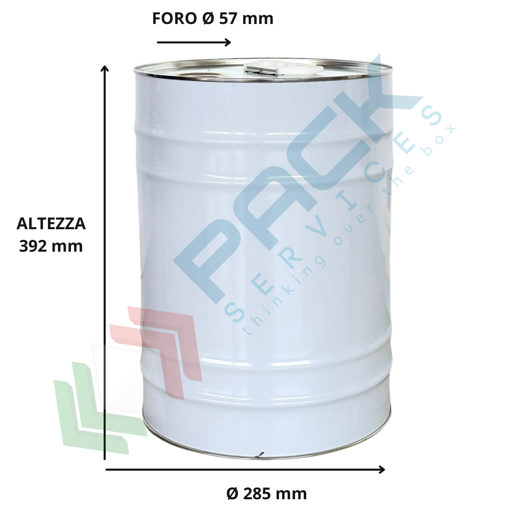 Fusto in ferro cilindrico foro Ø 57 mm, Mis. Ø 285 x 392 H mm, capacità nominale 20 Lt, capacità totale 22,5 Lt, omologato ADR/ONU, (tappo dosatore escluso), bianco int. grezzo