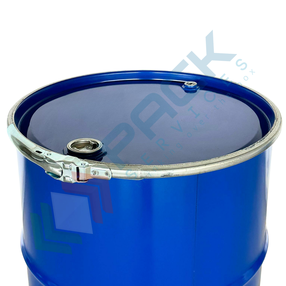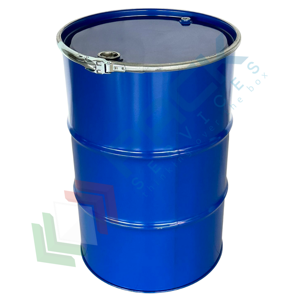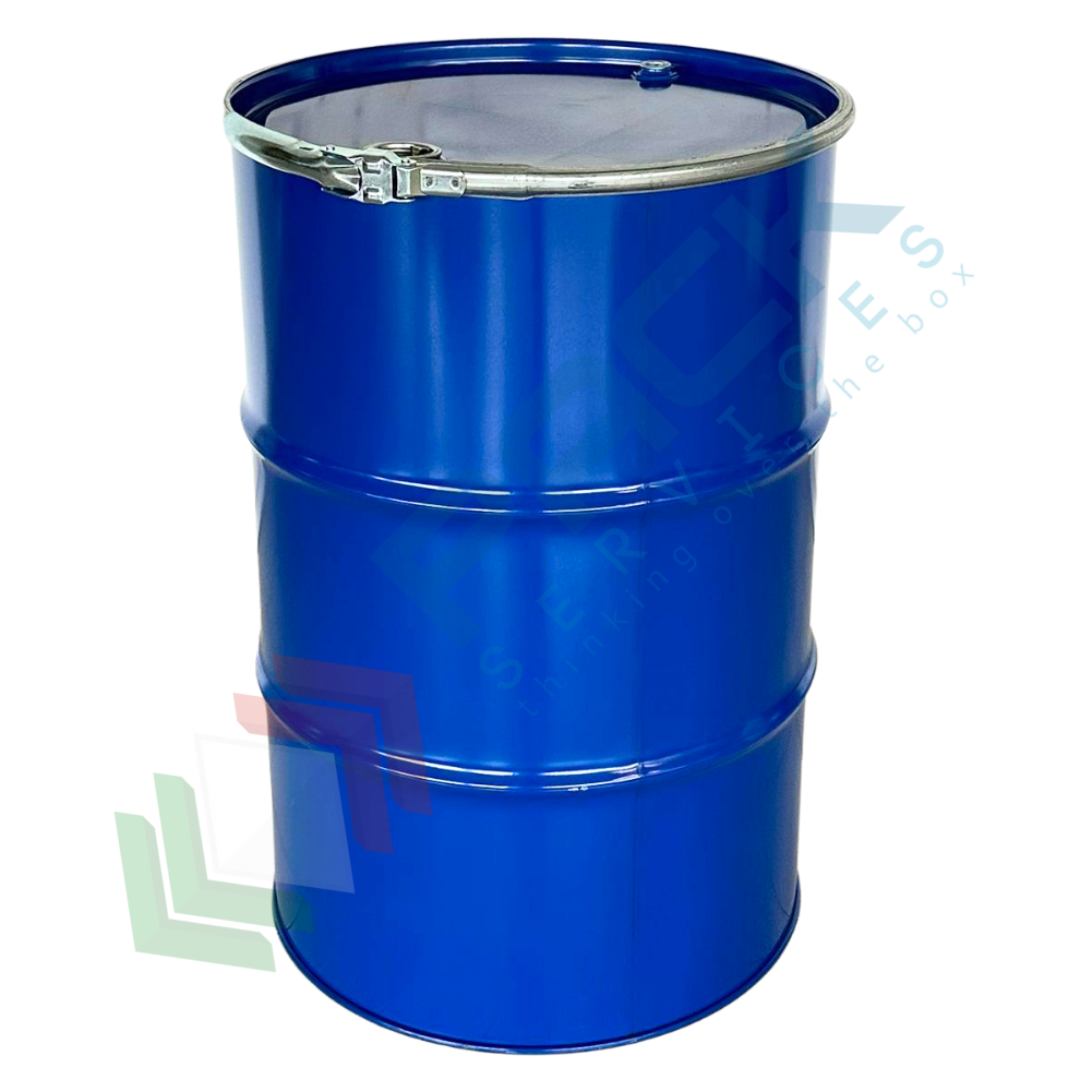 Fusto in ferro cilindrico ad apertura totale, capacità 220 Lt, ADR/ONU per liquidi, Mis. Ø 595 x 885 H mm, corpo blu interno grezzo, coperchio con cravatta e tappi Tri-sure (inclusi)
