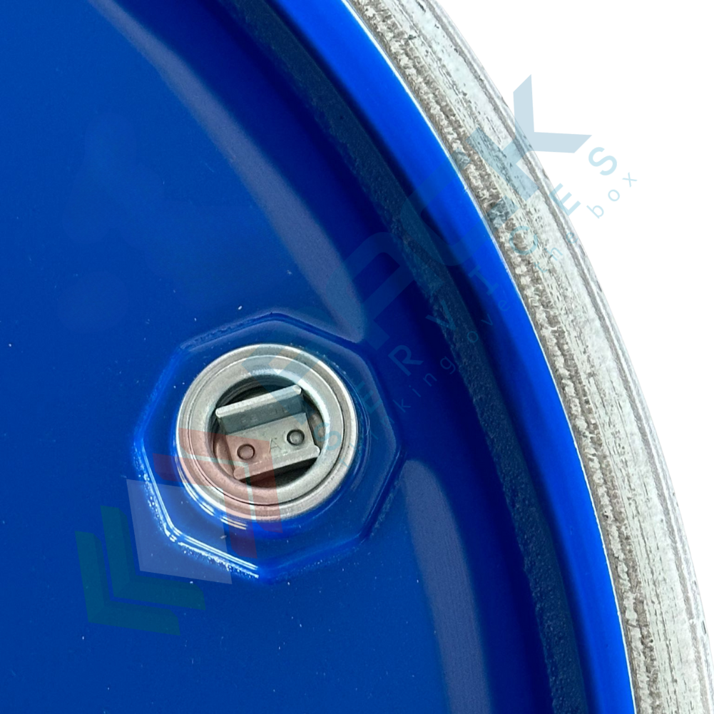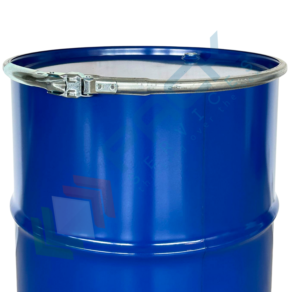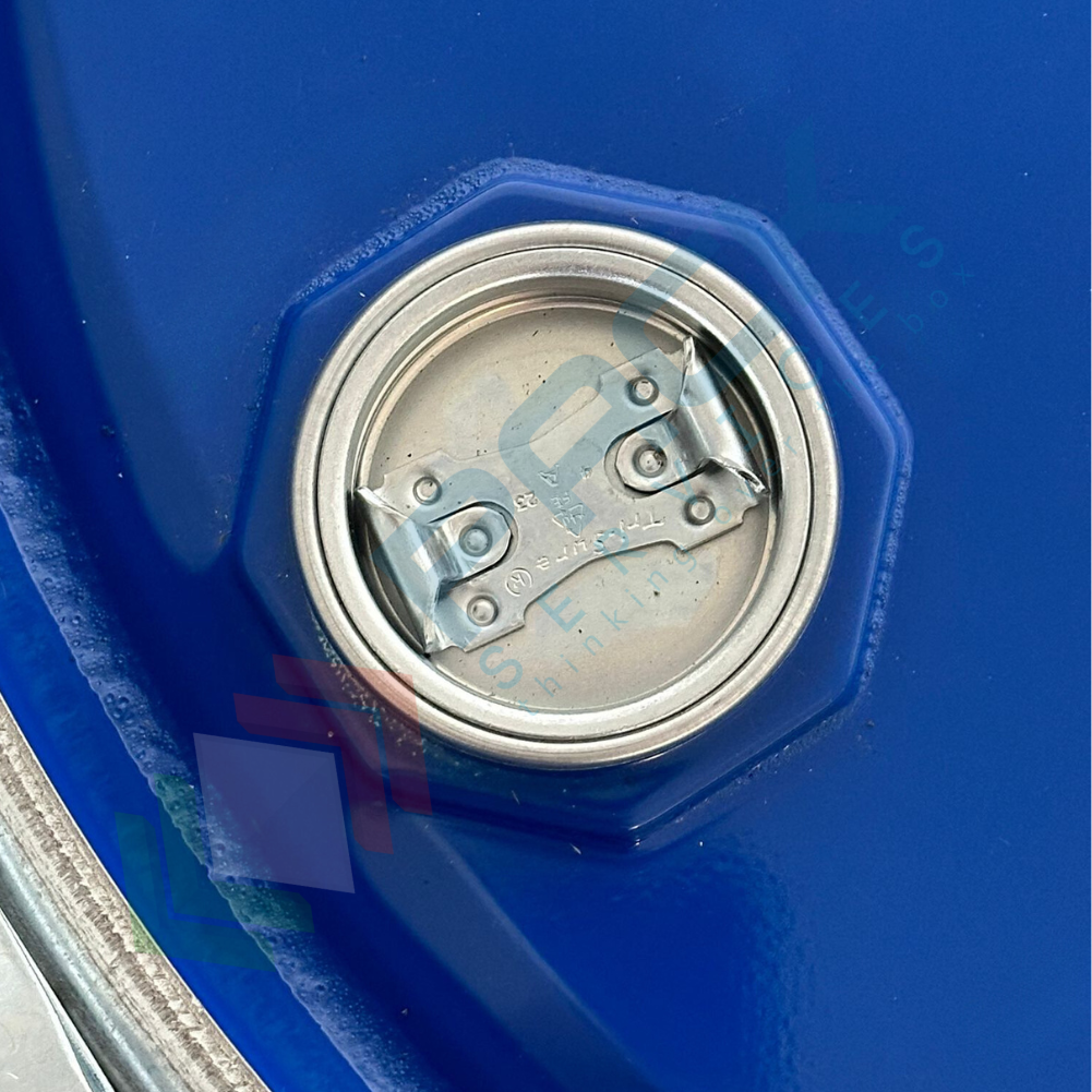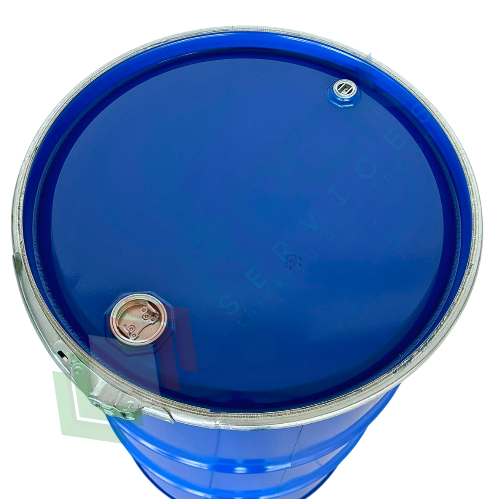 Fusto in ferro cilindrico ad apertura totale, capacità 220 Lt, ADR/ONU per liquidi, Mis. Ø 595 x 885 H mm, corpo blu interno grezzo, coperchio con cravatta e tappi Tri-sure (inclusi)