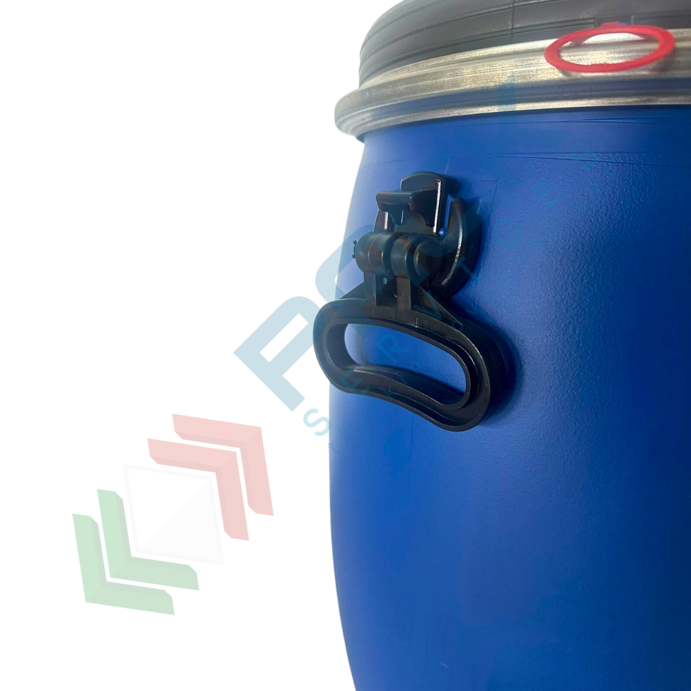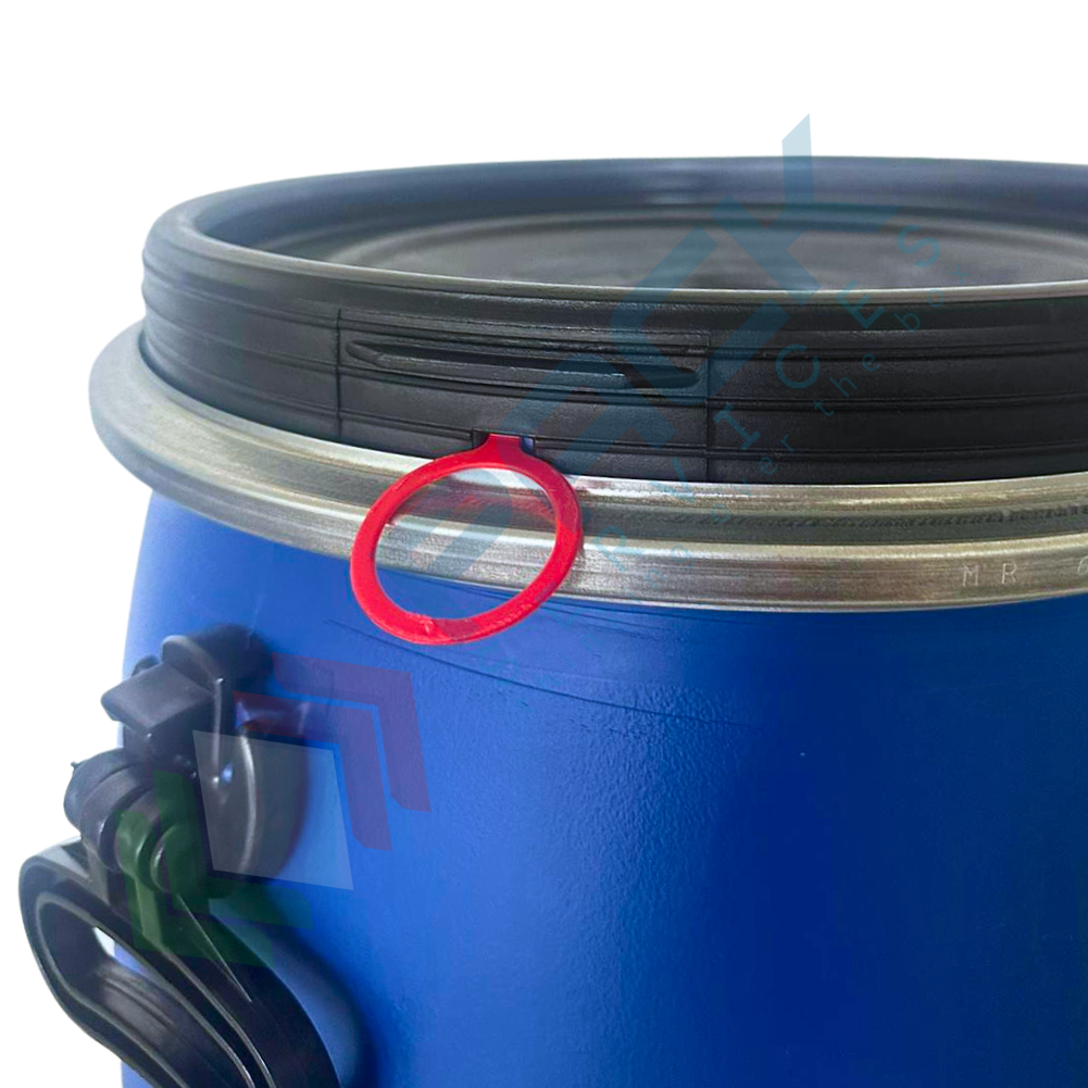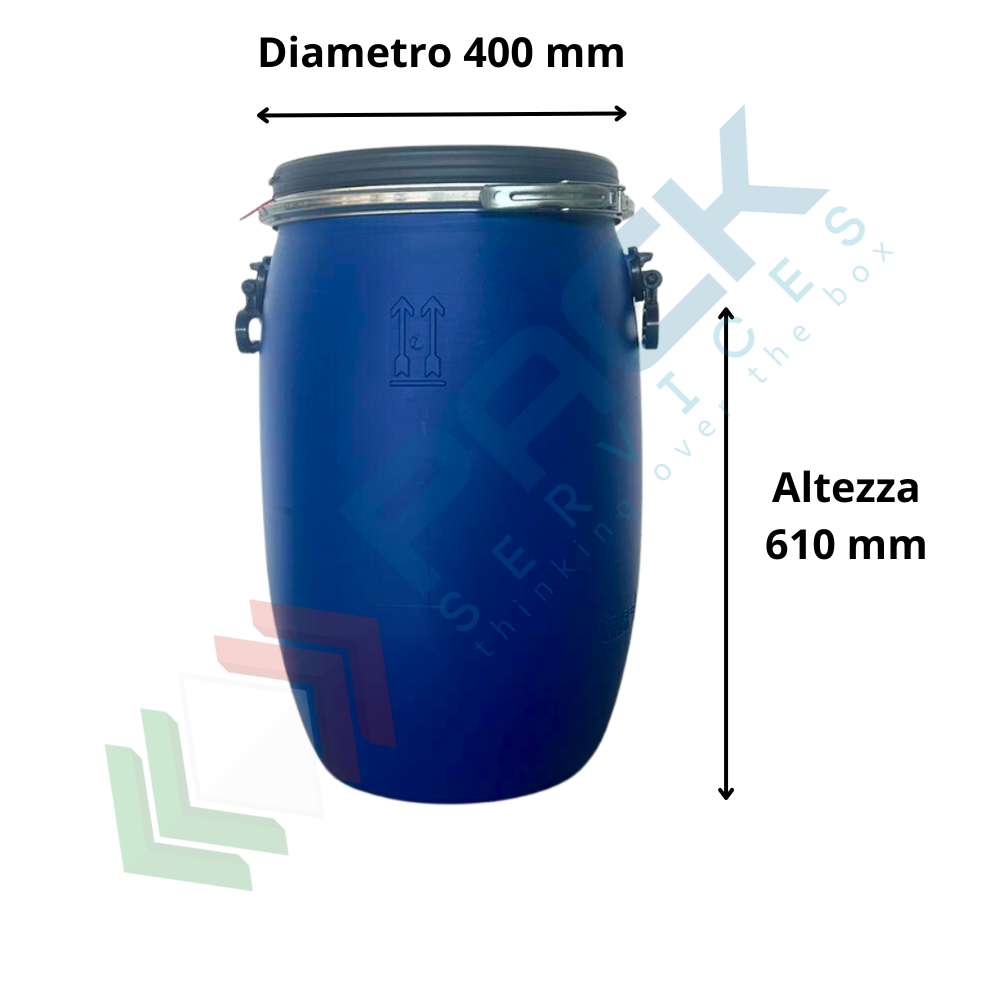 Fusto a bocca larga in plastica sezione rotonda, capacità 60 Lt, Mis. Ø 400 x 610 H mm, con 2 maniglie laterali. Fusto a bocca aperta in plastica (HDPE), colore blu, omologato UN per solidi (ONU 1H2/X88/S), utilizzato in accordo con le normative del trasporto terrestre, marittimo e aereo per la spedizione dei prodotti ritenuti pericolosi dall' ONU. Il coperchio, il corpo e l'anello del fusto in plastica è stato progettato per ottenere un'ottima resistenza alla caduta. Fusto top open rotondo omologato per solidi, con chiusura a cravatta metallica, idoneo per il trasporto di merce pericolosa. Il particolare sistema di chiusura a cravatta metallica di cui è dotato garantisce la massima sicurezza durante lo stoccaggio. Bidone in plastica NON idoneo al contatto alimentare, con coperchio con cravatta metallica incluso. Colore blu.