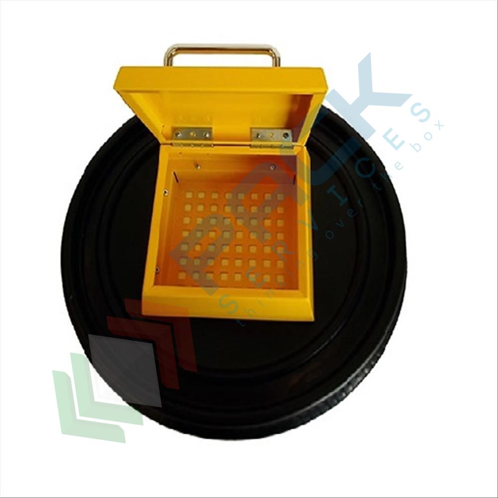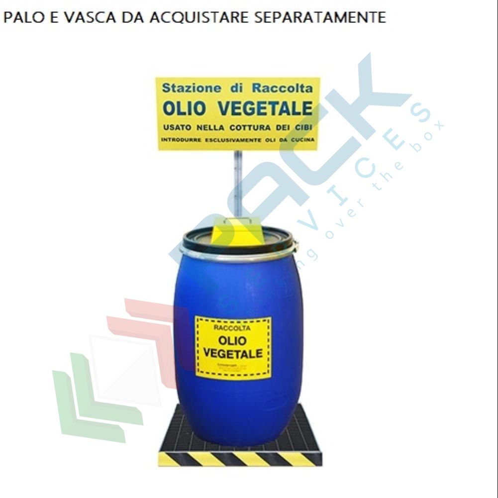 Fusto per la raccolta di olio vegetale usato "RistOil" capacità 120 Lt, Mis. Ø 470 L x 900 H mm, forma cilindrica verticale, fondo piano. Contenitore cilindrico realizzato con stampaggio in polietilene (PE) antiurto antiacido, con coperchio superiore asportabile con guarnizione incorporata, collare in acciaio zincato per chiusura ermetica con leva a scatto lucchettabile. Bocchetta monoblocco in acciaio zincato verniciato, incorporata al coperchio superiore, antiprelievo, fondo metallico a pozzetto con griglia interna inasportabile antisfondamento. Il fusto in plastica con bocchetta RistOil è studiato per la raccolta di olio vegetale esausto e grassi alimentari, quindi ideale per ristoranti, cucine, mense, condomini ecc... Il contenitore per la raccolta di olio usato è munito di scritta adesiva di identificazione del rifiuto. Il fusto è configurabile con la vasca di contenimento zincata con piano in PE a griglia fissa, blocco lucchettabile anti apertura, palo con cartello segnaletico per identificazione della zona di stoccaggio e indicatore di livello galleggiante.