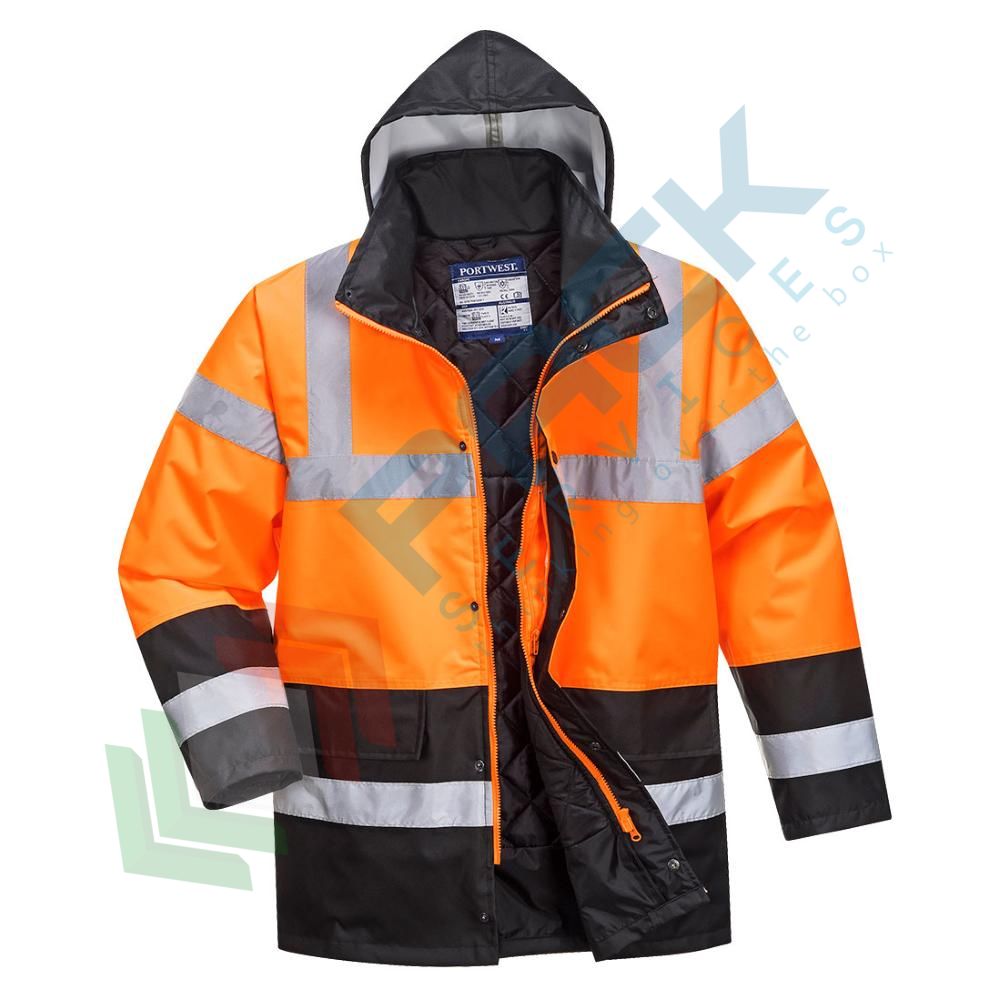 Giacca alta visibilità invernale e antipioggia 100% poliestere, modello Traffic Bicolore Hi-Vis, impermeabile con cuciture nastrate per prevenire la penetrazione dell'acqua, omologata EN ISO 20471 + EN 343 + EN 342, colore arancione/nero, taglia S