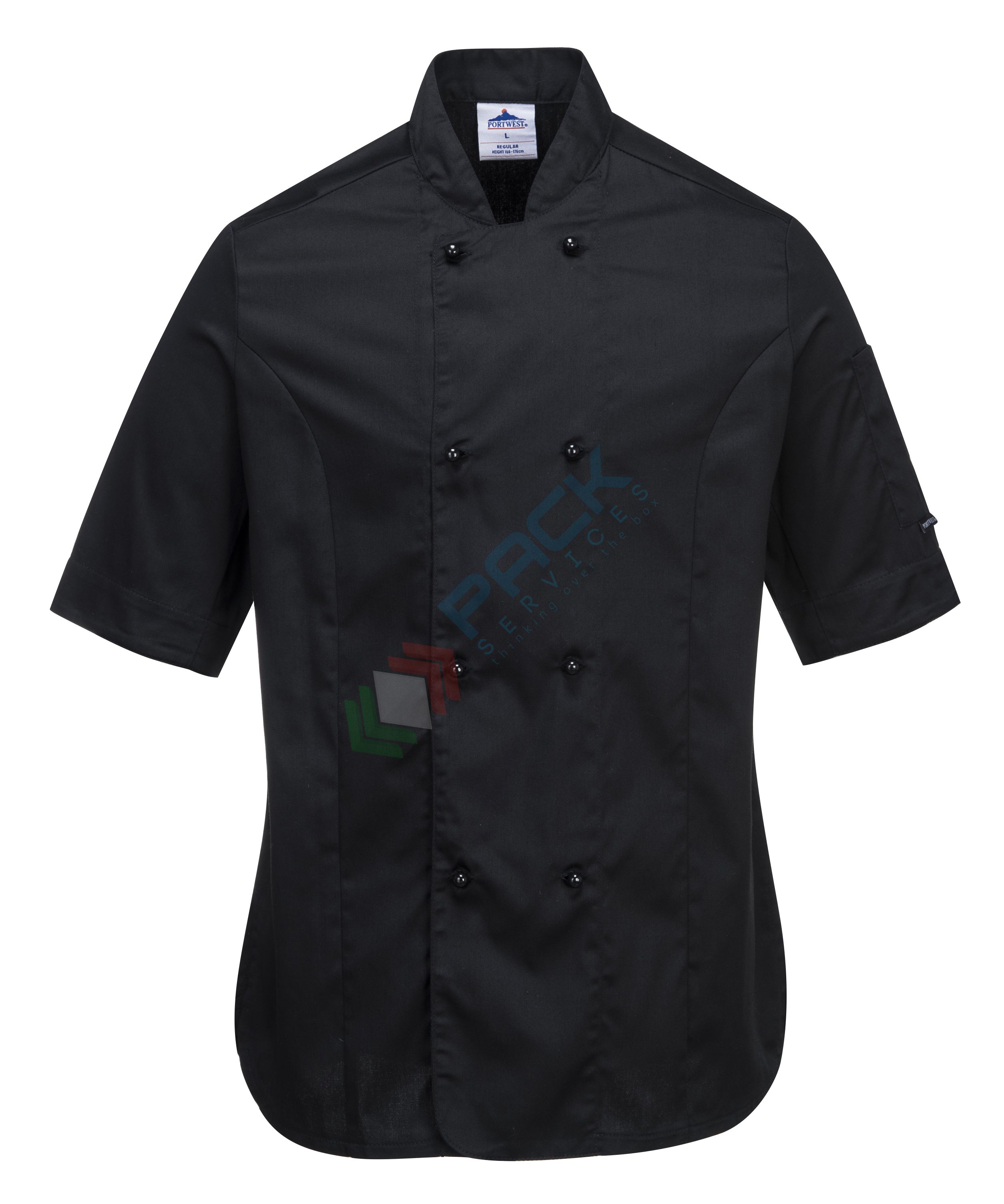 Giacca da lavoro, modello chef, tessuto MeshAir, da donna, 65% poliestere + 35% cotone, 1 tasca, 190 gr, manica corta, colore nero