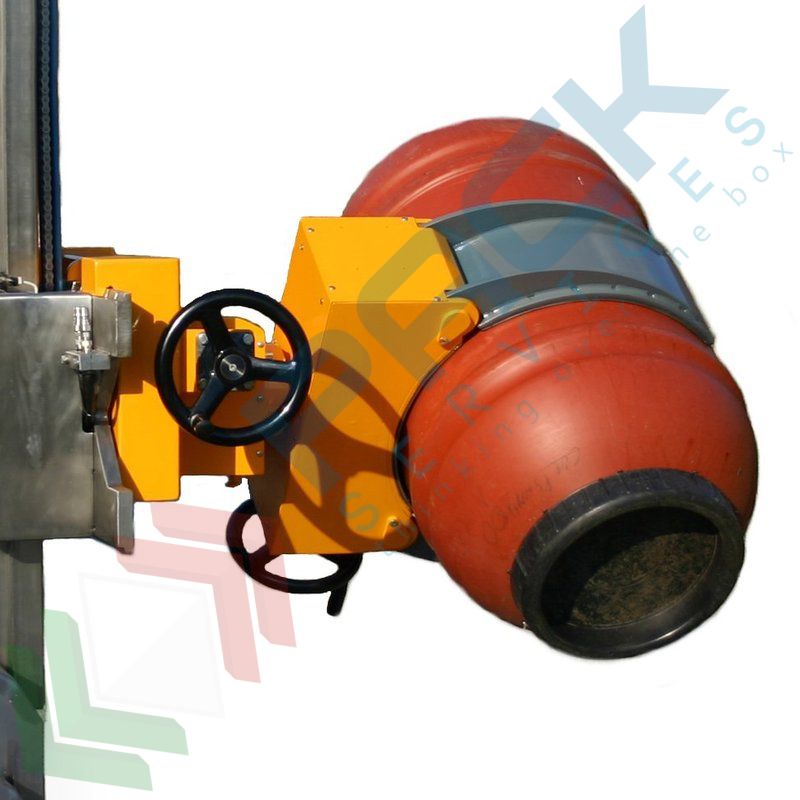 Svuotafusti manuale laterale applicabile alla piastra porta forche (Fem2) del carrello elevatore per ruotare fusti in metallo e plastica. Ribaltafusti ideale se si ha la necessità di ruotare fusti di diverso diametro e tipologia (ferro, plastica, cartone). Il fusto viene abbracciato da ganasce di presa alte 400 mm completamente rivestite in gomma intercambiabile, azionate manualmente da un volantino di serraggio; la rotazione continua a 360° avviene tramite l'azionamento manuale del rispettivo volantino che può ingranare con una catena per rendere più agevole da parte dell' operatore lo svuotamento dei fusti in quota. Dal punto di vista della sicurezza, il ribaltafusti è in grado di mantenere il fusto stabile nella posizione di svuotamento una volta ruotato. Il ribaltatore viene bloccato sulla piastra porta forche in maniera semplice e sicura tramite la staffa di serraggio.