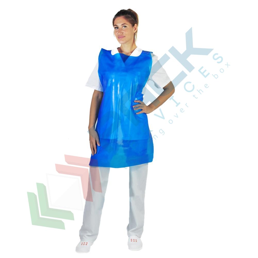 Grembiule usa e getta realizzato in polietilene goffrato a bassa intensità (LDPE), spessore 40 micron, Mis. 80 x 110 cm. Grembiule monouso impermeabile, realizzato con lacci per la chiusura sulla schiena. Il grembiule monouso è ideale per laboratori, per il settore medicale e il settore alimentare. Dispositivo di Protezione Individuale (D.P.I) di I categoria, solo per rischi minimi. Grembiule a pettorina unisex, ideale sia per uomo che per donna. Il prodotto non è marchiato come idoneo al contatto con alimenti, in quanto NON viene utilizzato per maneggiare il cibo ma solo per proteggere l'operatore da schizzi ecc. Colore blu, taglia unica. Confezione composta da 50 pezzi.