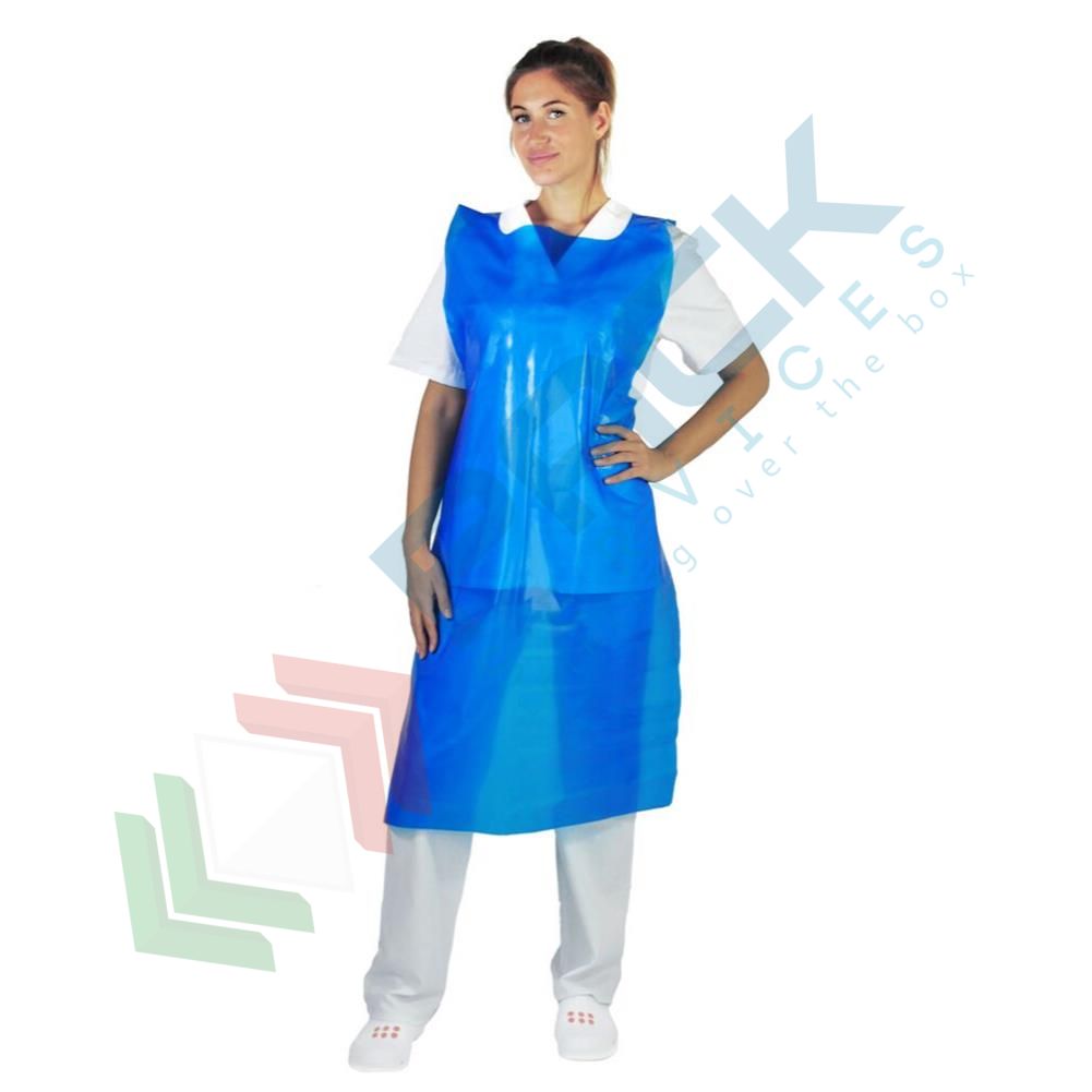 Grembiule usa e getta realizzato in polietilene goffrato a bassa intensità (LDPE), spessore 50 micron, Mis. 100 x 160 cm. Grembiule monouso impermeabile, realizzato con lacci per la chiusura sulla schiena. Il grembiule monouso è ideale per laboratori, per il settore medicale e il settore alimentare. Dispositivo di Protezione Individuale (D.P.I) di I categoria, solo per rischi minimi. Grembiule a pettorina unisex, ideale sia per uomo che per donna. Il prodotto non è marchiato come idoneo al contatto con alimenti, in quanto NON viene utilizzato per maneggiare il cibo ma solo per proteggere l'operatore da schizzi ecc. Colore blu, taglia unica. Confezione composta da 25 pezzi.