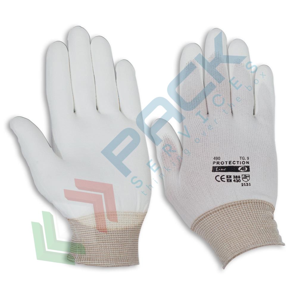 Guanti antinfortunistici da lavoro in filato di nylon con palmo ricoperto in poliuretano. I polsini in nylon e lattice permettono una perfetta aderenza al polso. Guanti da lavoro certificati CE, EN 388 (Guanti di protezione contro i rischi meccanici). Prodotto venduto a paia. Colore bianco, taglia 6.