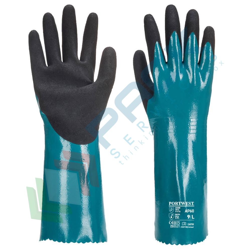Guanti da lavoro protezione chimica in nitrile ad immersione, palmo ruvido con rivestimento flessibile in nitrile sabbioso, 1,3 mm di spessore, 300 mm di lunghezza, omologati EN 388 + EN 374, colore blu/nero, taglia M