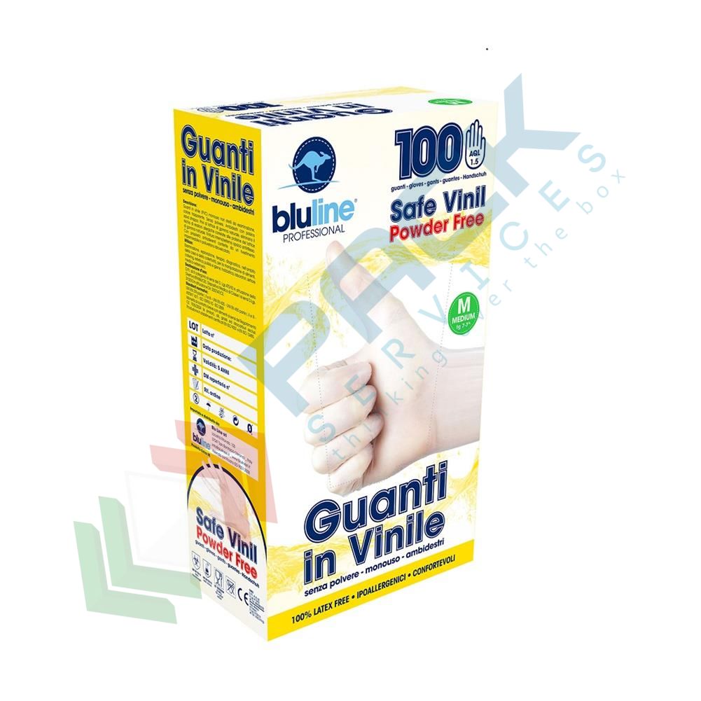 Guanti da lavoro monouso in vinile senza polvere, ambidestri, con polsino salva strappo. Privi di lattice di gomma naturale, eliminano il rischio di reazioni allergiche correlate alle proteine del lattice di gomma naturale. L'assenza di polvere riduce anche il rischio di dermatiti. Finitura interna/ esterna opaca antiriflesso. Con proprietà antiaderenti conferite ad un rivestimento impermeabile in poliuretano idroveicolato. DPII III categoria e Dispositivo medico di classe I, idonei al contatto con alimenti. Colore trasparente. Confezione 100 pezzi.