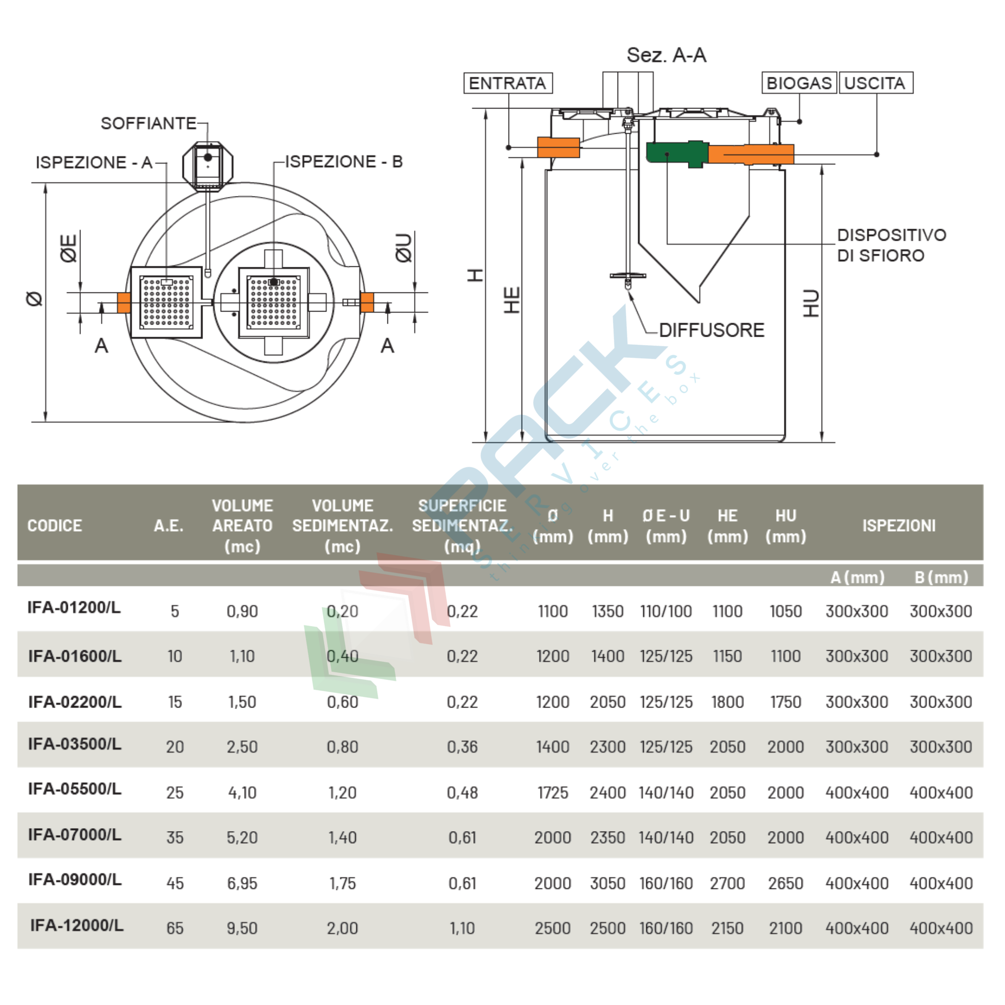 Impianto fanghi attivi corpo liscio, A.E. 45, mis. Ø 2000 x H 3050 mm, capacità 9000 Lt. E' un impianto a fanghi attivi ad aerazione prolungata o ad ossidazione totale. Le caratteristiche del refluo trattato risultano accettabili secondo Decreto Legislativo 3 Aprile 2006 n° 152 TAB 3 Allegato 5 e successive modifiche. Il principio di funzionamento è classico, basato sull’ossidazione dei liquami mediante fornitura forzata di aria e sulla successiva decantazione del fango prodotto all’interno di un vano di quiete. I tempi di ossidazione garantiscono oltre alla depurazione delle acque anche la stabilizzazione del fango che risulta con un buon grado di mineralizzazione. L'impianto fanghi attivi garantisce: riduzione del numero dei componenti l’impianto con conseguente semplificazione del processo; elevato standard depurativo e caratteristiche dell’effluente omogenee; modesta quantità di fango prodotto; basso consumo energetico; semplicità di conduzione e gestione; assenza di odori molesti. Lo sfioratore di uscita presenta il TE (raccordo a T) in uscita.