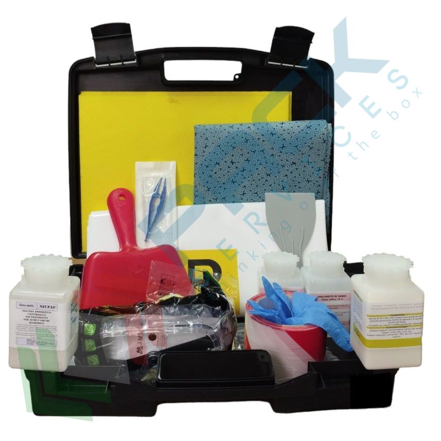 Contenente tutto il necessario per: proteggere il personale addetto con l'utilizzo di idonei DPI / assorbire e bonificare velocemente con materiali assorbenti / pulire con strumenti di raccolta e contenitori per lo smaltimento dei rifiuti.