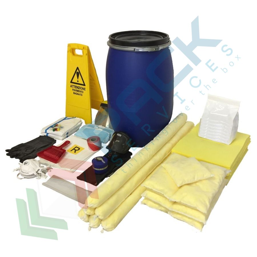Gestione dei rischi legati allo spandimento accidentale di prodotti o preparati chimici, anche a seguito di caduta accidentale di provette, matracci, beute o altro. Rappresenta uno strumento da utilizzare al fine di salvaguardare l'incolumità dei lavoratori, dei visitatori nonché dell'ambiente. Contenente tutto il necessario per: - proteggere il personale addetto con l'utilizzo di idonei DPI- assorbire e bonificare velocemente con materiali assorbenti- pulire con strumenti di raccolta e contenitori per lo smaltimento dei rifiuti.