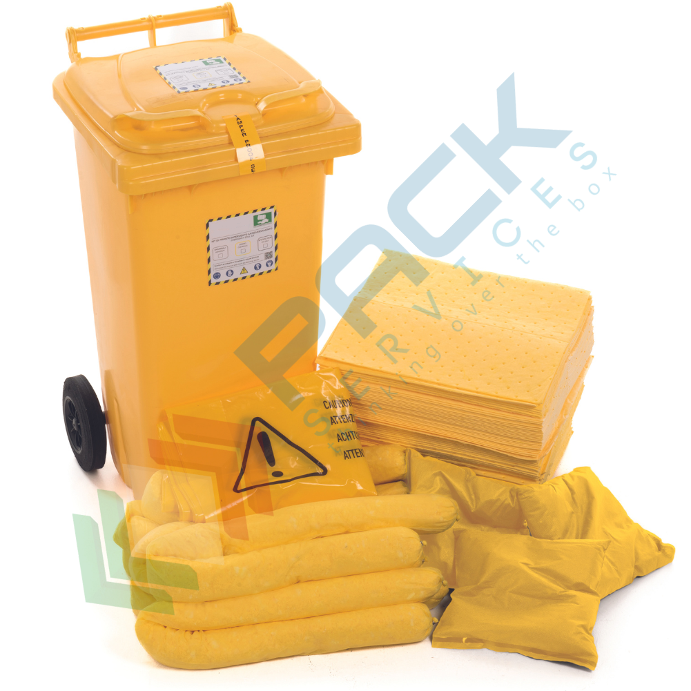 Kit di pronto intervento per prodotti chimici, confezionato in contenitore su ruote, adatto anche per pavimentazioni sconnesse, per medi sversamenti Mis. 90 x 64 x 115 cm. Kit emergenza antisversamento con capacità assorbente 360 Lt, ideale per prodotti chimici come liquidi agressivi, caustici e tossici e per la maggior parte dei liqudi industriali. Il kit antisversamento per sostanze chimiche contiene 200 panni, 6 salsicciotti 7x5 x 122,2 cm, 4 salsicciotti 5 x 3 mt, 10 cuscini, 1 paio di guanti, 1 paio di occhiali, 10 sacchi smaltimento. I contenitori carrellati rappresentano una soluzione specializzata per il pronto intervento in caso di emergenze ambientali, progettati specificatamente come postazioni mobili per la rimozione immediata di sostanze inquinanti. Questi sistemi carrellati sono stati concepiti per rispondere alle esigenze di industrie, aziende di trasporto, officine e altre realtà professionali che necessitano di un intervento rapido ed efficace in caso di sversamenti accidentali. La caratteristica principale di questi contenitori risiede nella loro mobilità, che consente di trasportare rapidamente tutto il materiale necessario direttamente sul luogo dell'incidente da bonificare. Questa funzionalità si rivela fondamentale per minimizzare i tempi di intervento e limitare l'impatto ambientale di eventuali contaminazioni. Gli assorbenti industriali per prodotti chimici sono essenziali nei casi in cui non si ha la certezza di quale liquido si