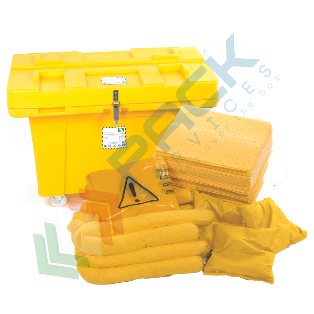 Kit di pronto intervento per prodotti chimici, confezionato in contenitore su ruote, adatto anche per pavimentazioni sconnesse, per medi sversamenti Mis. 120 x 84 x 90 cm. Kit emergenza antisversamento con capacità assorbente 700 Lt, ideale per prodotti chimici come liquidi agressivi, caustici e tossici e per la maggior parte dei liqudi industriali. Il kit antisversamento per sostanze chimiche contiene 500 panni, 10 salsicciotti, 16 cuscini, 2 paia di guanti, 2 paia di occhiali, 20 sacchi smaltimento. I contenitori carrellati rappresentano una soluzione specializzata per il pronto intervento in caso di emergenze ambientali, progettati specificatamente come postazioni mobili per la rimozione immediata di sostanze inquinanti. Questi sistemi carrellati sono stati concepiti per rispondere alle esigenze di industrie, aziende di trasporto, officine e altre realtà professionali che necessitano di un intervento rapido ed efficace in caso di sversamenti accidentali. La caratteristica principale di questi contenitori risiede nella loro mobilità, che consente di trasportare rapidamente tutto il materiale necessario direttamente sul luogo dell'incidente da bonificare. Questa funzionalità si rivela fondamentale per minimizzare i tempi di intervento e limitare l'impatto ambientale di eventuali contaminazioni. Gli assorbenti industriali per prodotti chimici sono essenziali nei casi in cui non si ha la certezza di quale liquido si