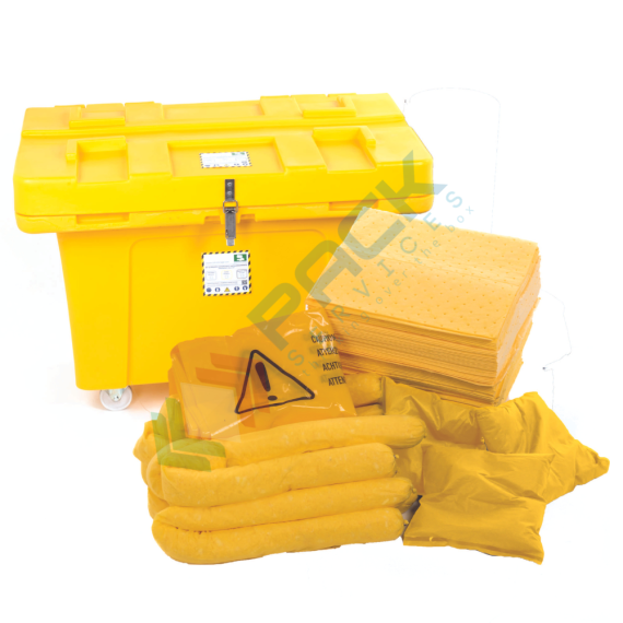 Kit di pronto intervento per prodotti chimici, carrellato, capacità assorbimento 700 Lt, confezionato in cassonetto con ruote