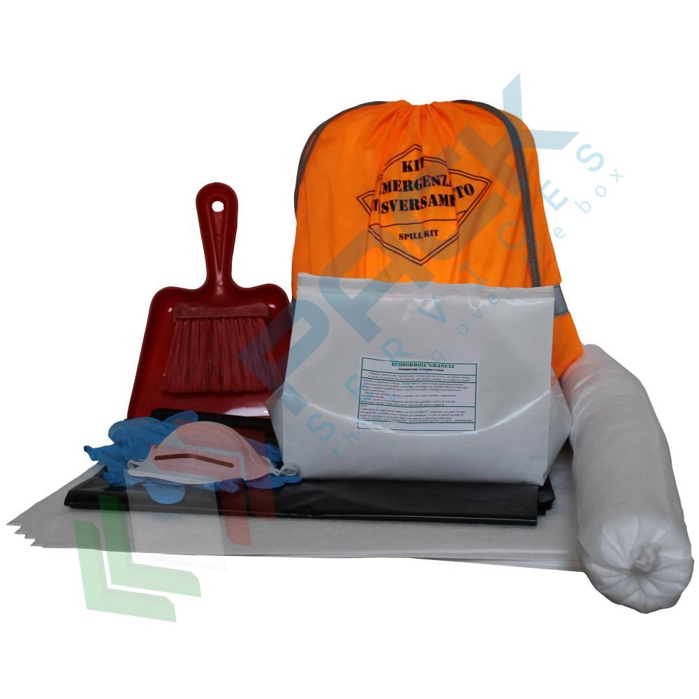 Kit di pronto intervento per oli, idrocarburi e derivati (anche in presenza di acqua), confezionato in sacca zaino in poliestere arancione con banda catarinfrangente Mis. 36 x 41 cm. Kit emergenza antisversamento con capacità assorbente 8 Lt.