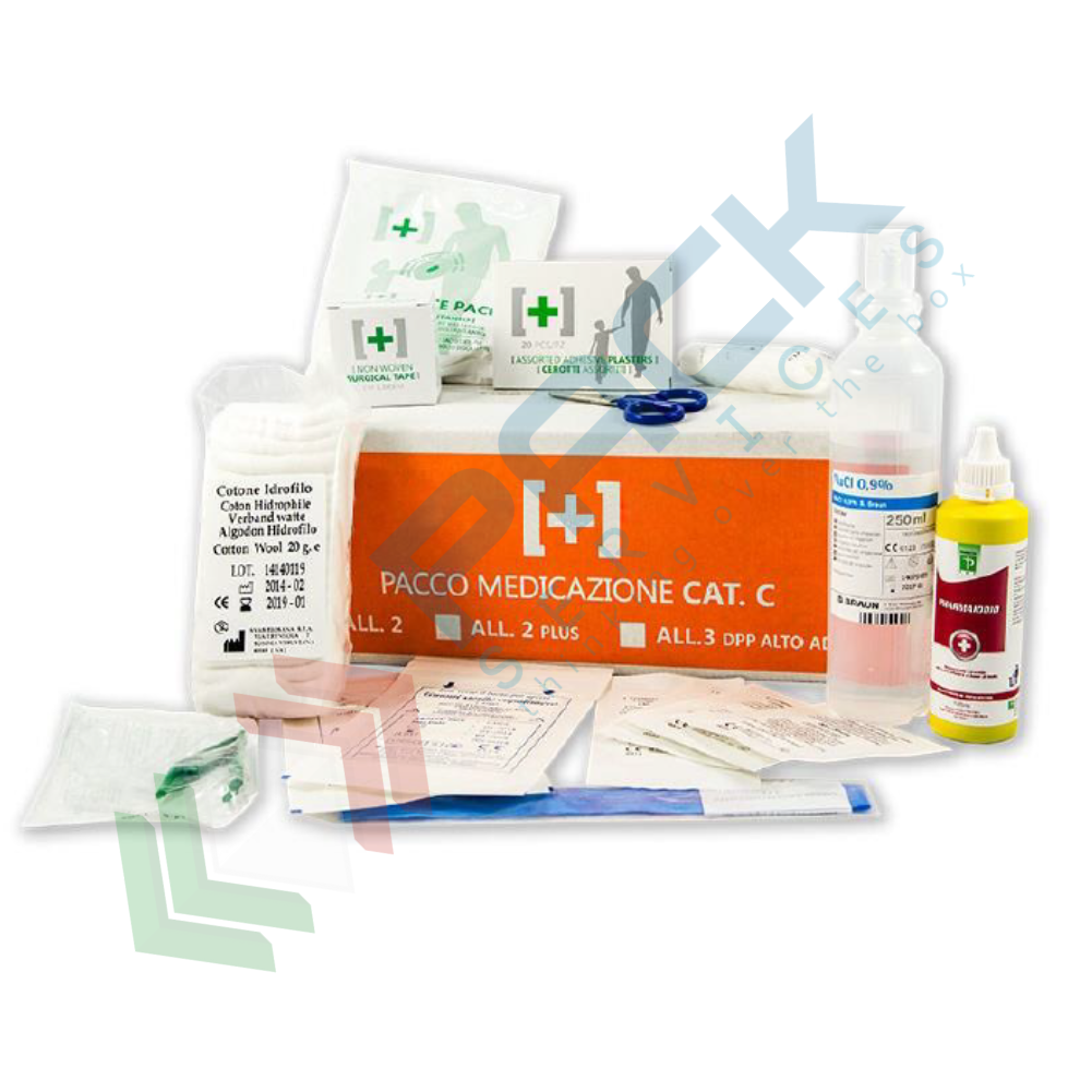 Pacco medicazione per cassette pronto soccorso e armadietti primo soccorso completo del contenuto previsto dall'allegato 2 del D.M. 388 del 15 luglio 2003 e D.L. 81 del 09 aprile 2008 art. 45, obbligatorio quindi per aziende o unità produttive del gruppo C con meno di tre lavoratori. L?art.2 punto 5 del DM 388 del 15.7.2003 prevede che il contenuto dell?allegato 2 deve essere fornito anche ai lavoratori che operano in luoghi diversi dalla sede aziendale o unità produttiva. Il contenuto del kit reintegro primo soccorso prevede un contenuto base, ovvero tutti i prodotti necessari in caso di emergenza come cerotti, guanti, garze, termometro, forbici e molto altro.