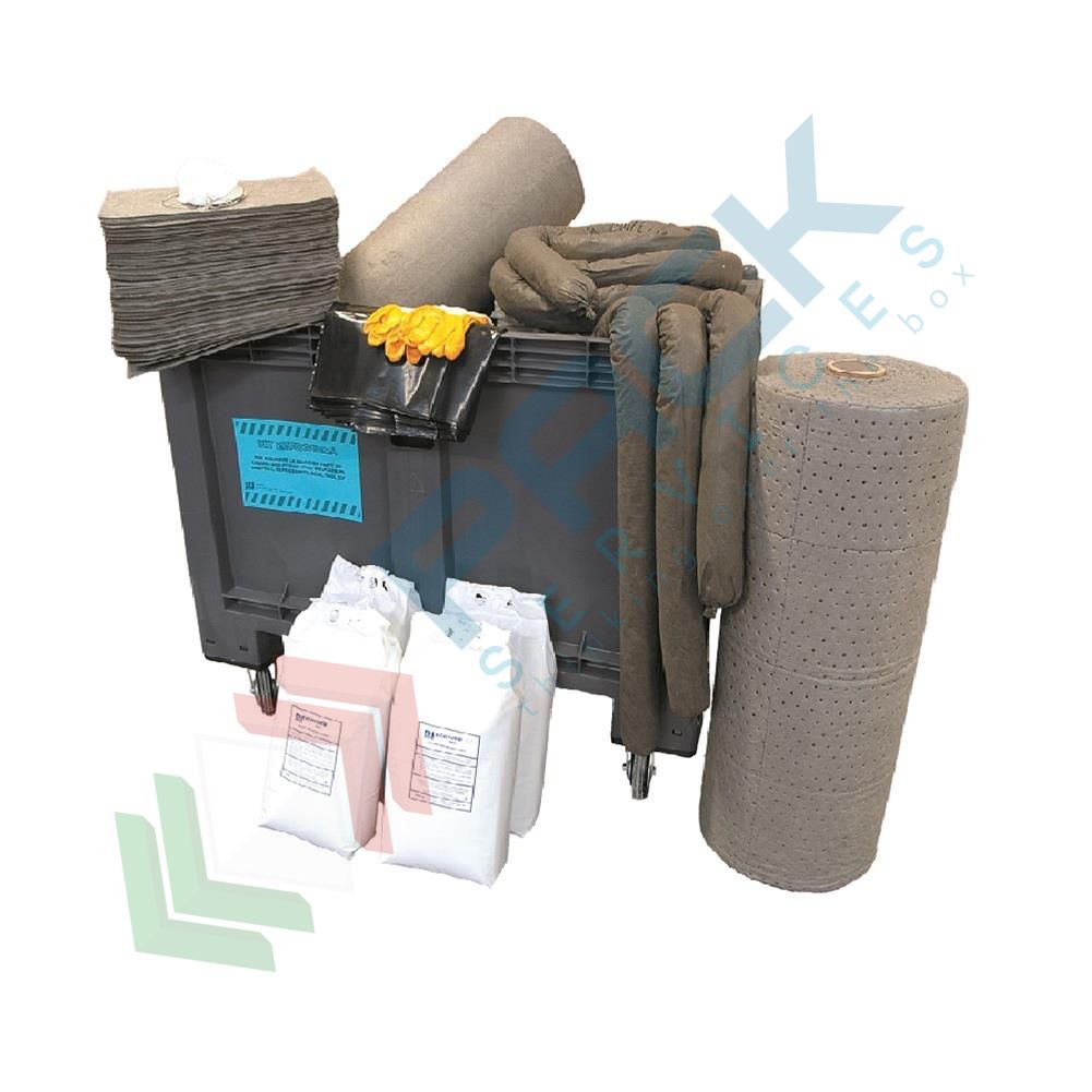 Kit di emergenza antisversamento per per assorbire la maggior parte dei liquidi industriali, liquidi organici ed inorganici, idrocarburi, solventi, antigelo, acidi, basici, ecc. Confezionato in cassa pallet con ruote e coperchio, per fronteggiare sversamenti molto estesi. Contenuto 200 fogli assorbenti; 1 rotolo; 4 sacchi 7 Kg Ecosorboil fine assorbente granulare; 5 cuscini; 8 manicotti (2 modelli diversi); 10 sacchi per gli scarti; 4 paia di guanti; 8 mascherine (2 modelli diversi); 4 tute; 4 occhiali; 1 manuale istruzioni. Capacità di assorbimento 575 Lt. Kit di pronto intervento per assorbire la maggior parte dei liquidi industriali, liquidi organici e inorganici, idrocarburi, solventi, antigelo, acidi, basici, ecc.