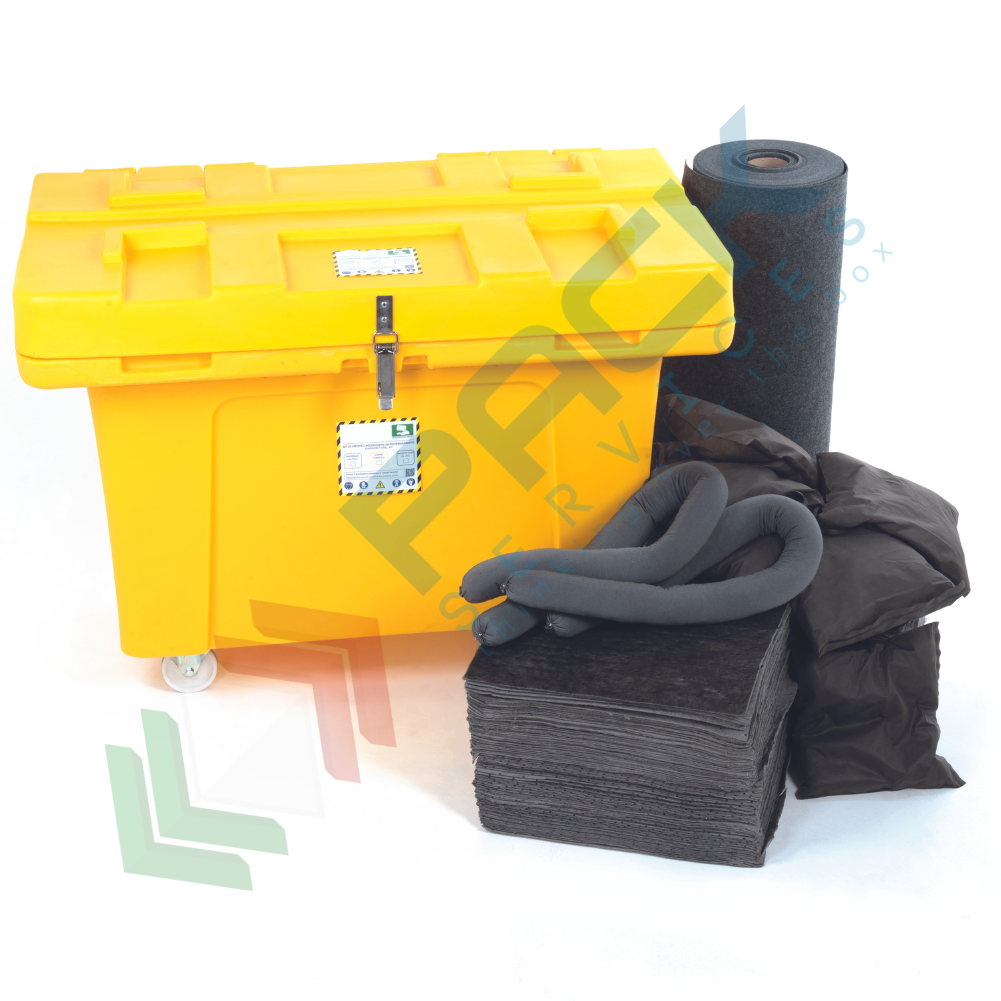 Kit di pronto intervento universale, confezionato in cassonetto carrellato Mis. 1200 L x 840 P x 900 H mm, ideale per assorbire la maggior parte dei liquidi industriali come liquidi inorganici ed organici, idrocarburi, solventi, olii, refrigeranti, antigelo e molto altro. Pratico kit assorbente ideale per essere portato velocemente e facilmente sul luogo dell'incidente. Kit di pronto intervento universale con capacità assorbente di 700 Litri. Il kit antisversamento universale contiene 500 panni, 10 salsicciotti, 16 cuscini, 2 paia di guanti, 2 paia di occhiali, 20 sacchi smaltimento.
