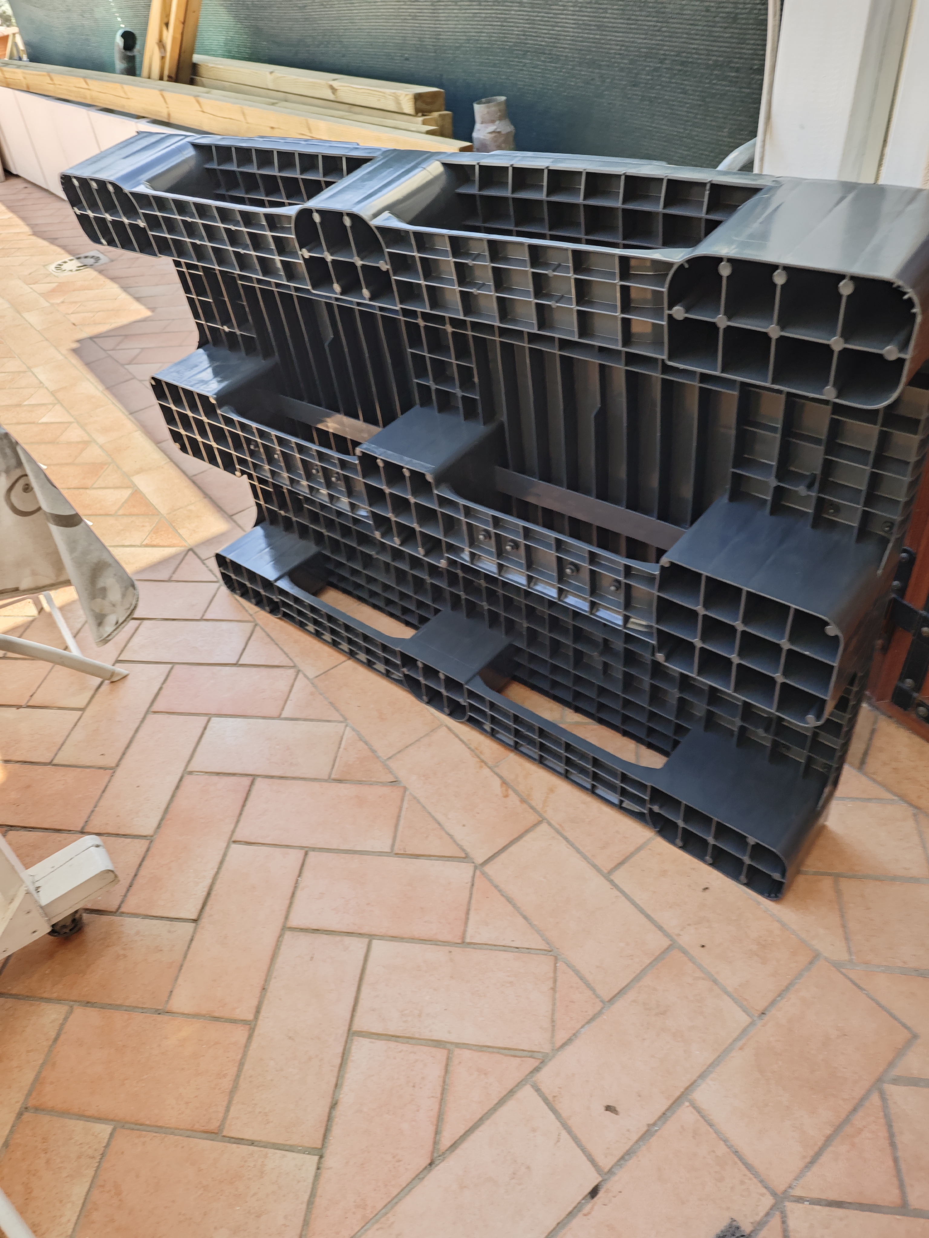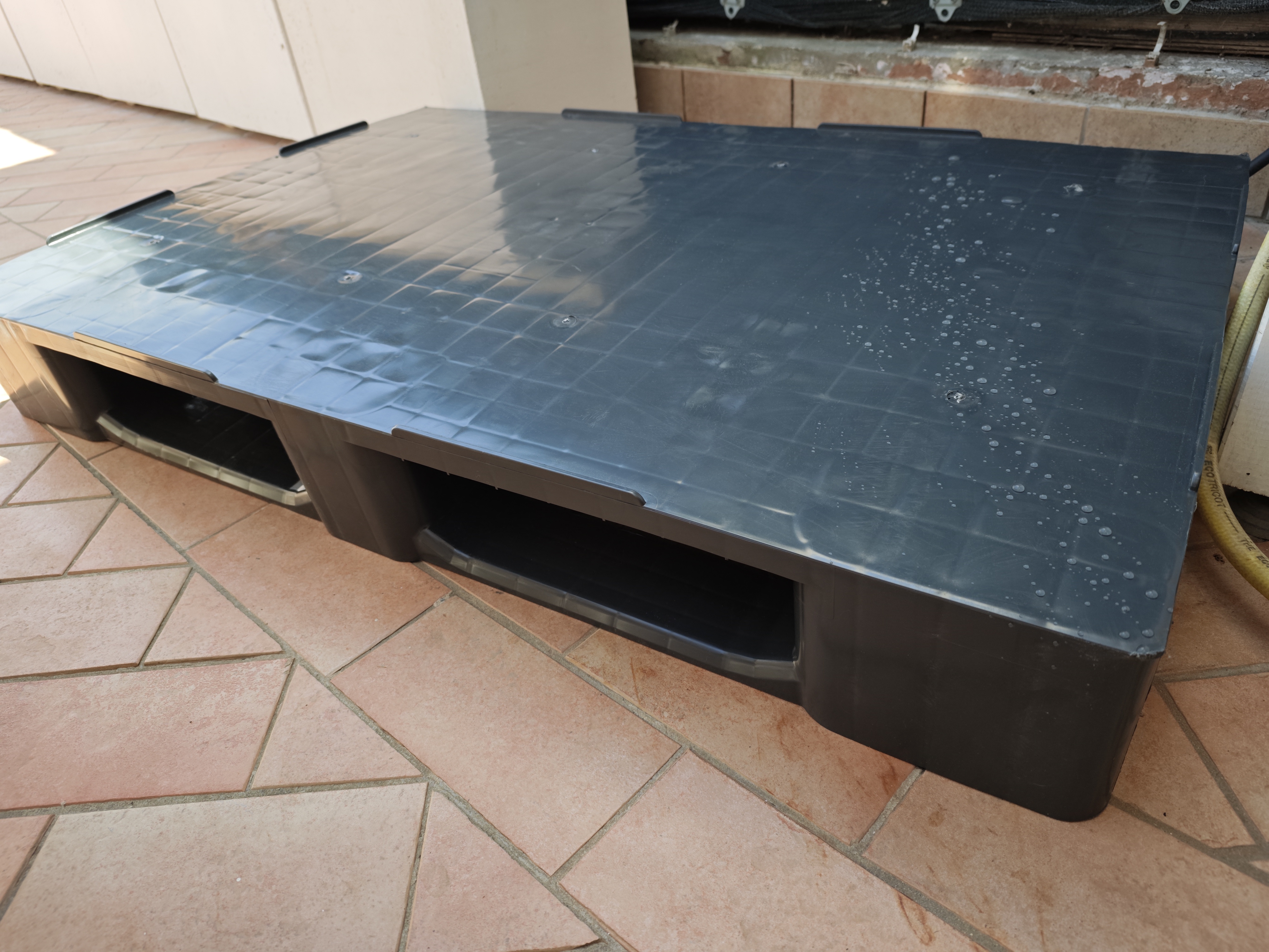 Pallet in plastica (HDPE), Mis. 1000 L x 1200 P x 150 H mm, con 3 traverse, piano forato, portata statica 2500 Kg, portata dinamica 1000 Kg, portata su scaffale 400 Kg