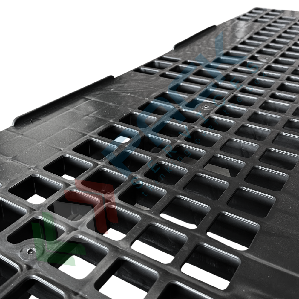 Pallet in plastica riciclata (PP), Mis. 1000 L x 1200 P x 150 H mm, con 5 traverse, piano forato, portata statica 2000 Kg, portata dinamica 750 Kg, portata su scaffale 400 Kg