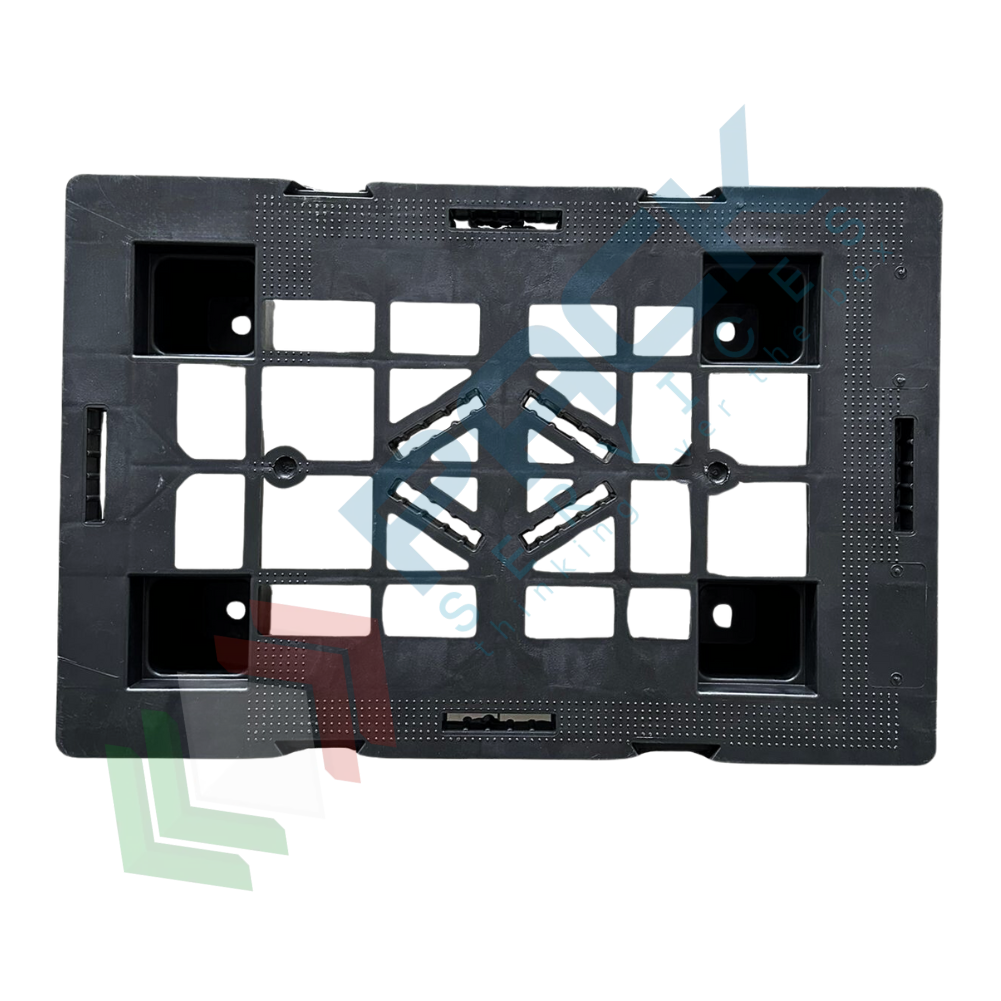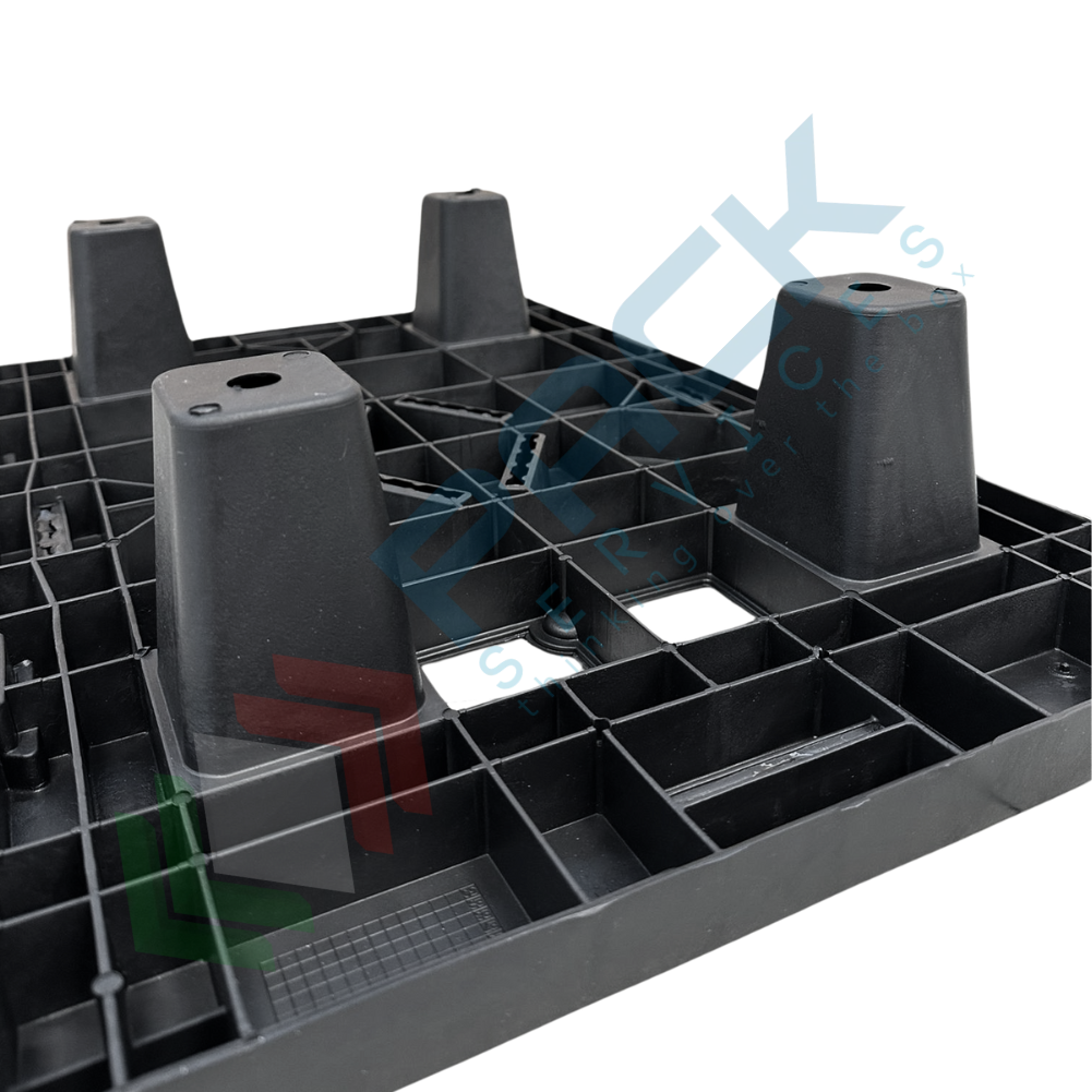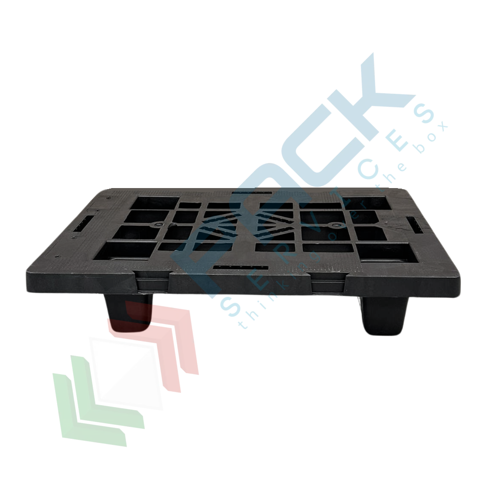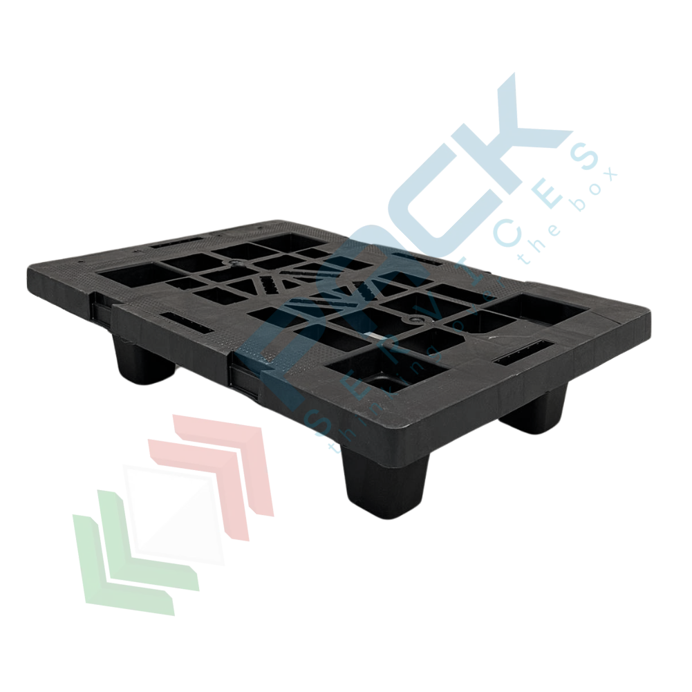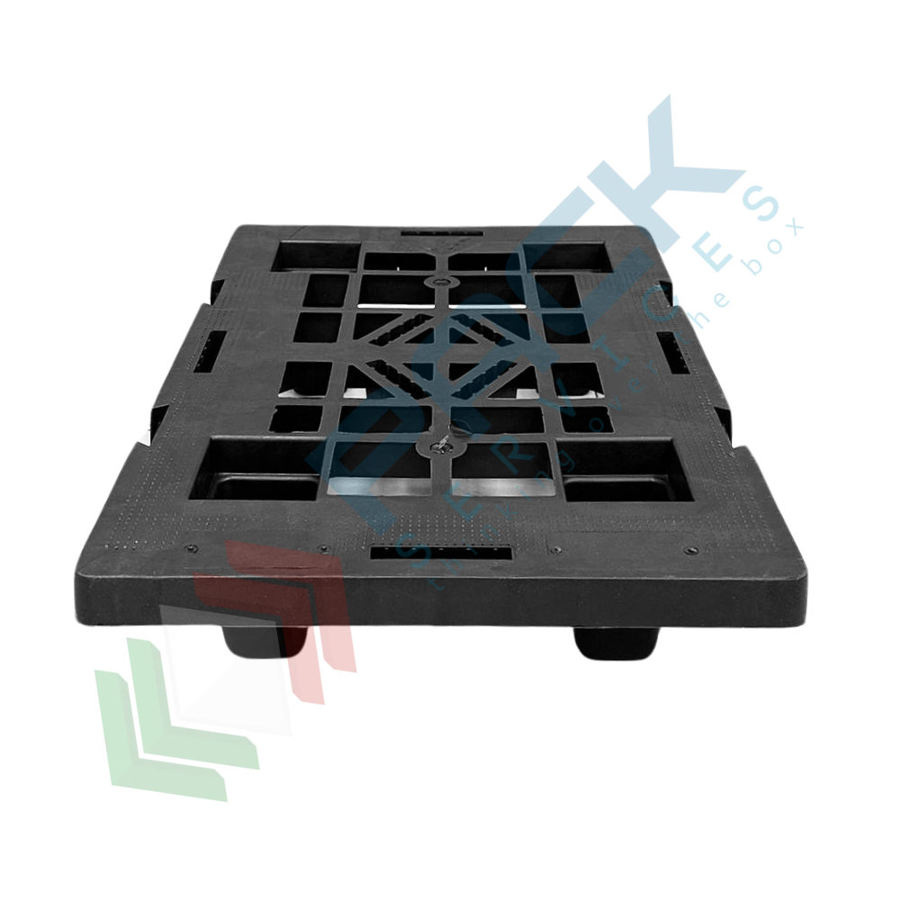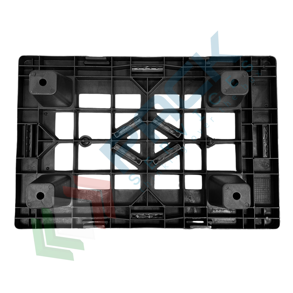 Bancale in plastica riciclata (PP), Mis. 400 L x 600 P x 124 H mm, base di appoggio 4 piedi, portata dinamica 200 Kg, portata statica 700 Kg, piano superiore forato. Pallet in plastica leggera, inseribile per un risparmio notevole di spazio, soprattutto in fase di stoccaggio, con elevata capacità di carico. Non richiede alcuna manutenzione particolare, esente da danneggiamento per intemperie ed umidità, resistente alle alte e basse temperature. Il bancale di plastica è maneggevole, può essere inforcato con traspallet o carrello elevatore. Colore grigio/nero. Pallet plastica NON idoneo al contatto alimentare.