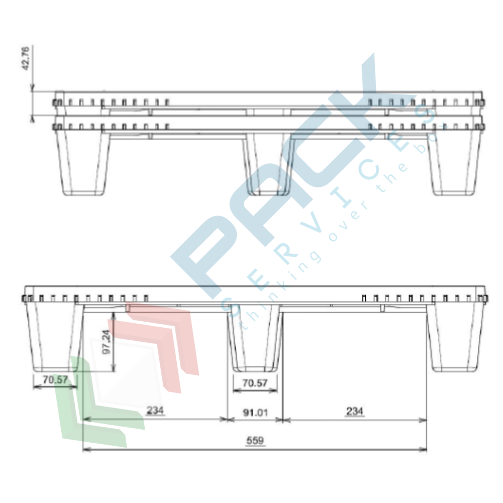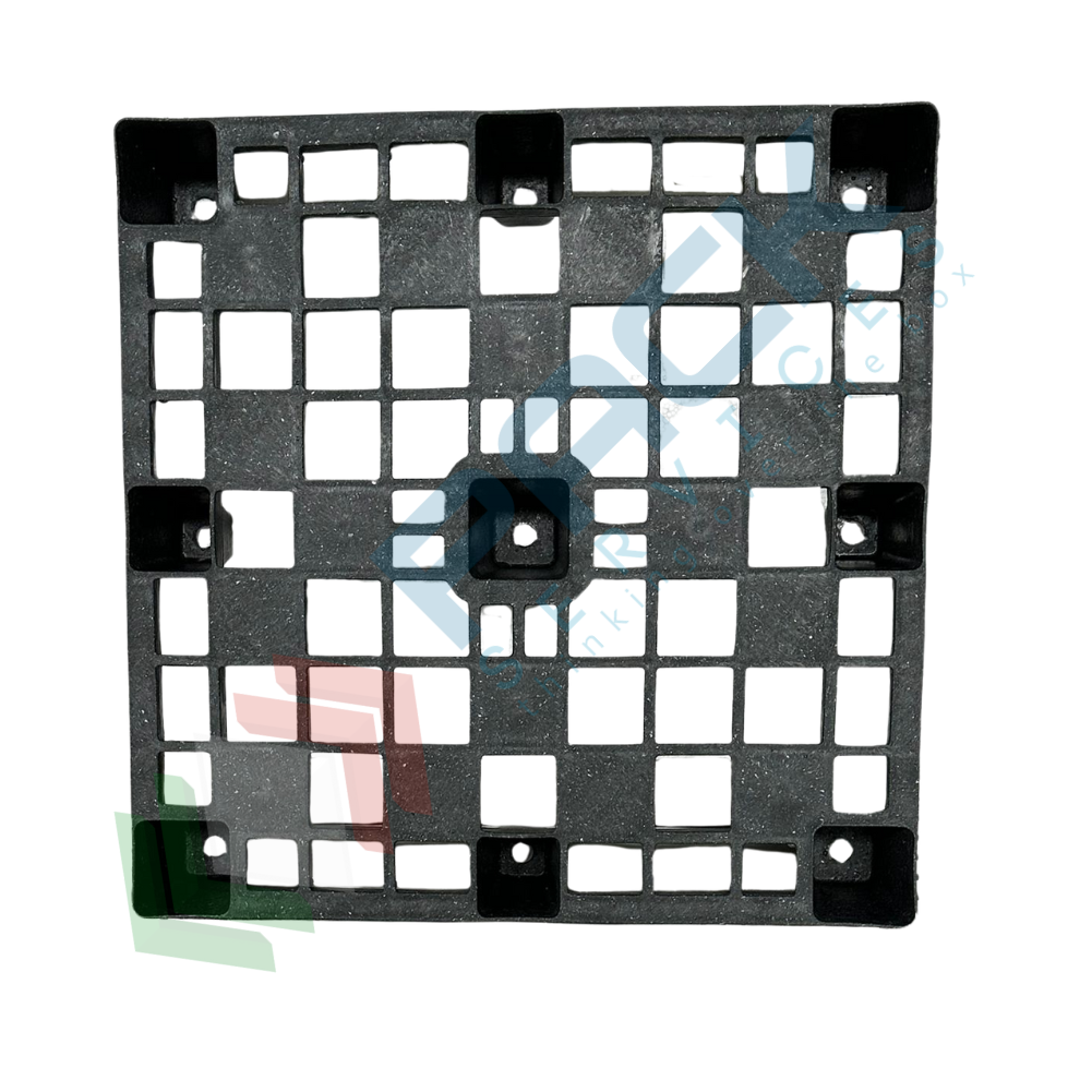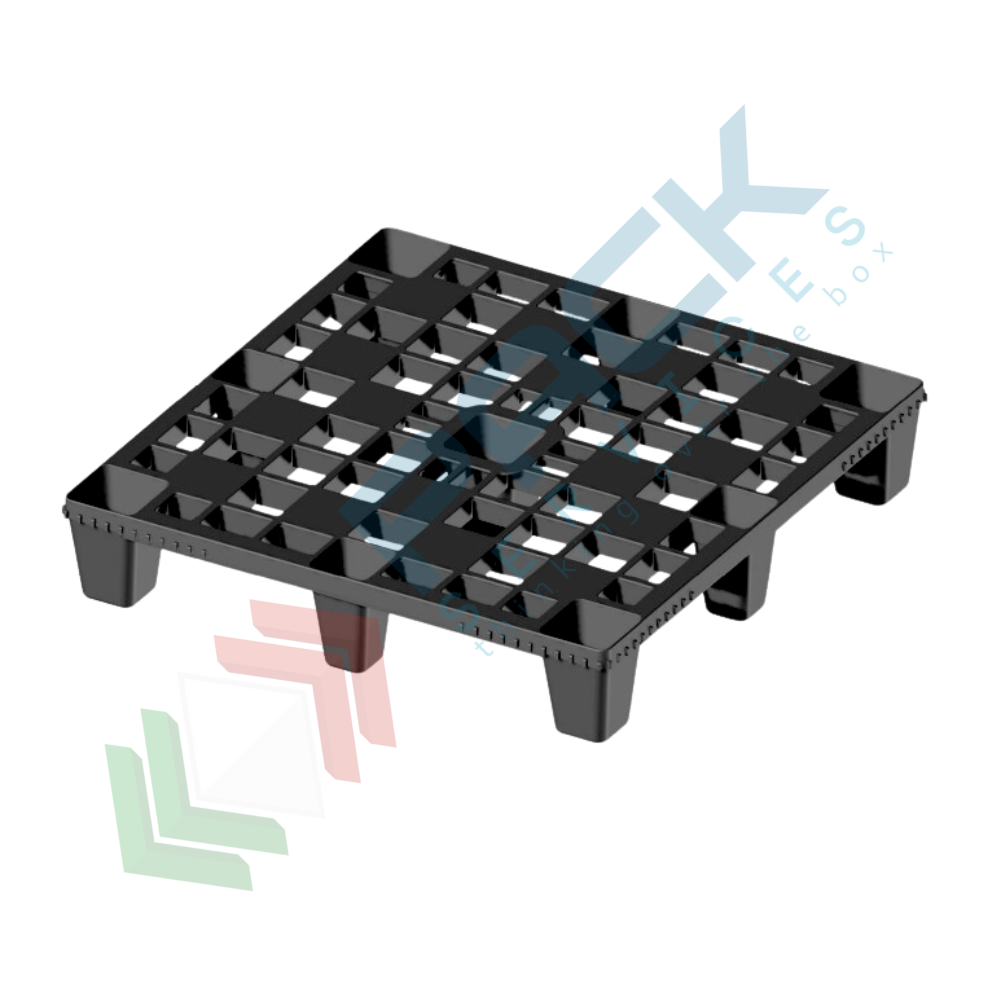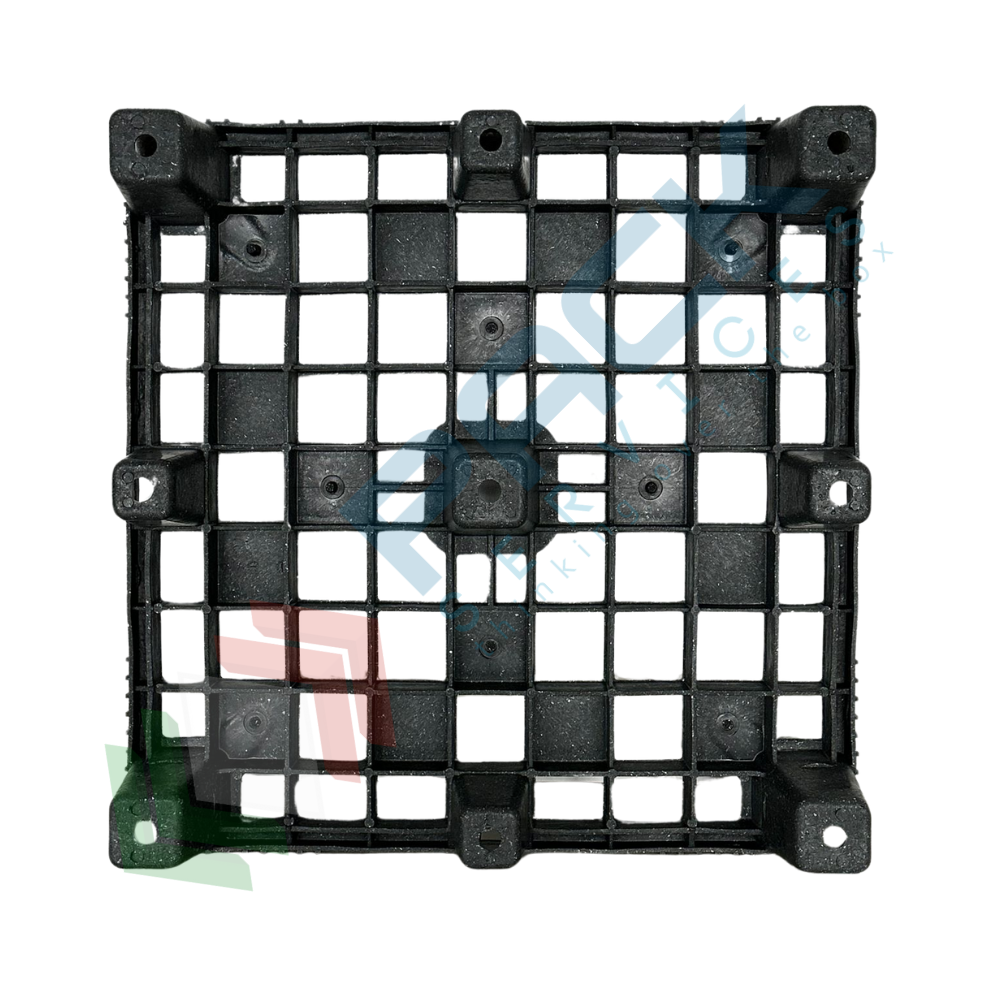 Bancale in plastica riciclata (PP), Mis. 750 L x 750 P x 140 H mm, base di appoggio 9 piedi, portata dinamica 300 Kg, portata statica 600 Kg, piano superiore forato. Pallet in plastica leggera, inseribile per un risparmio notevole di spazio, soprattutto in fase di stoccaggio, con elevata capacità di carico. Non richiede alcuna manutenzione particolare, esente da danneggiamento per intemperie ed umidità, resistente alle alte e basse temperature. Il bancale di plastica è maneggevole, può essere inforcato da tutti e 4 i lati con traspallet o carrello elevatore. Colore grigio/nero. Pallet plastica NON idoneo al contatto alimentare.