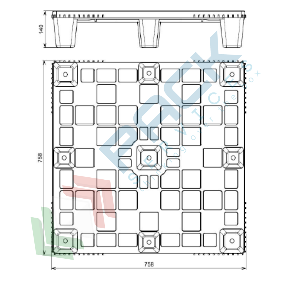 Pallet in plastica riciclata (PP), Mis. 750 L x 750 P x 140 H mm, con 9 piedi, piano forato, portata statica 600 Kg, portata dinamica 300 Kg