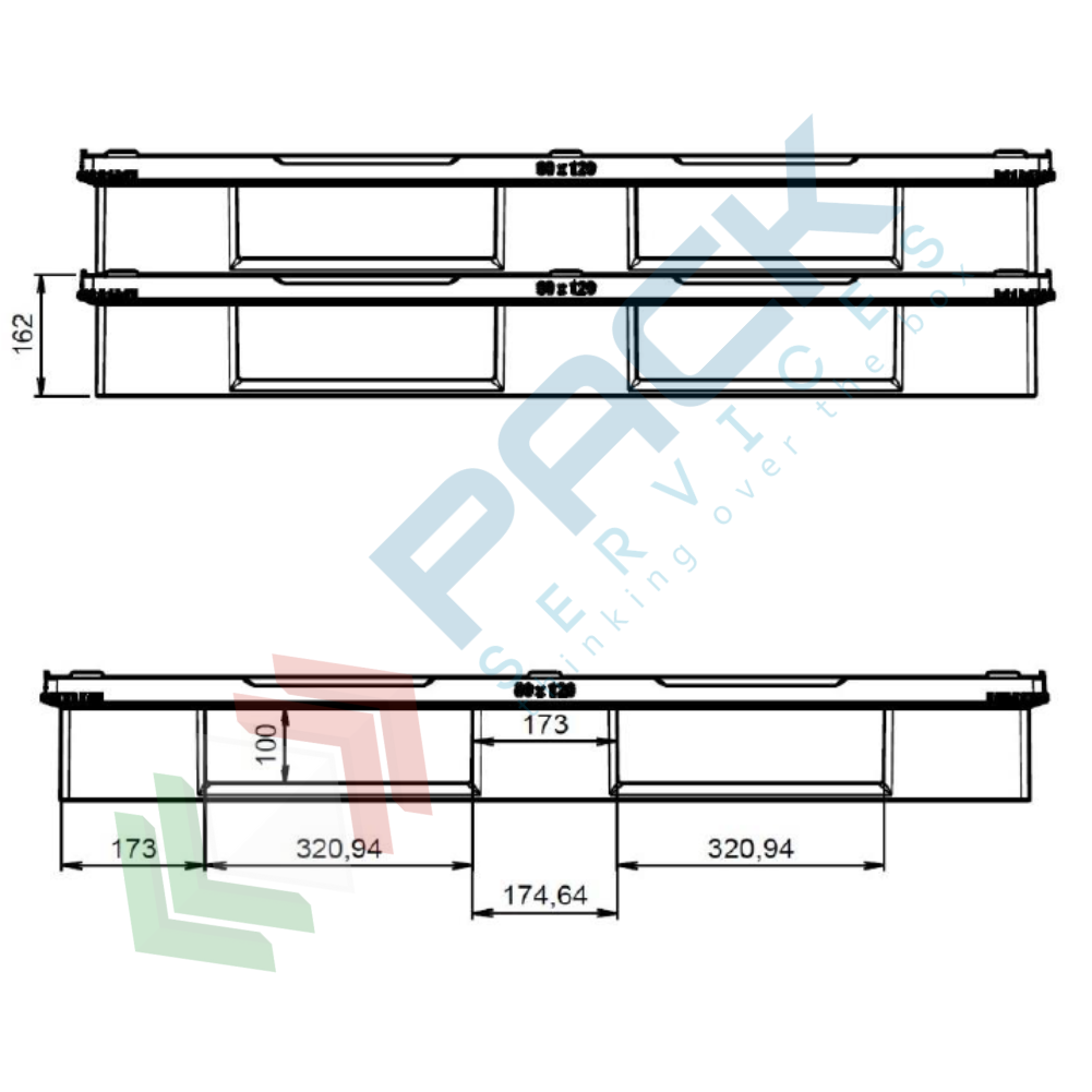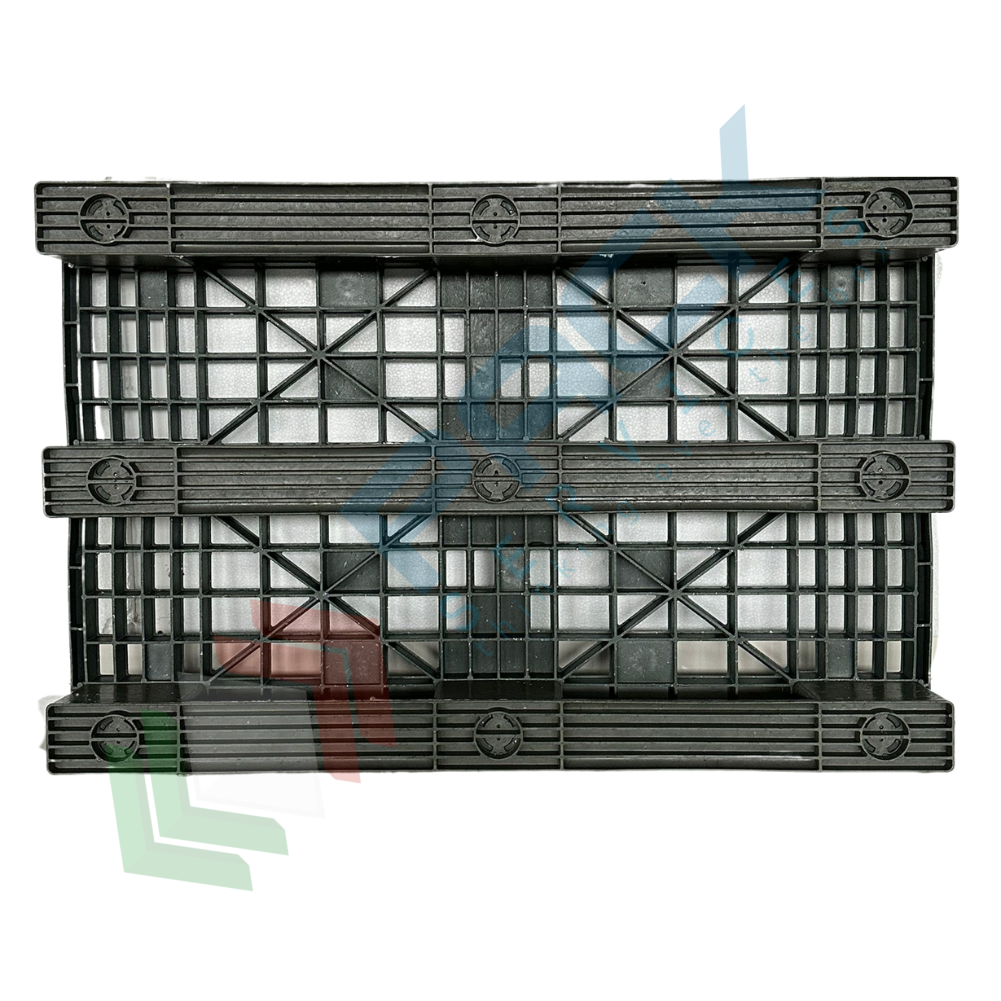 Pallet in plastica riciclata (PP), Mis. 800 L x 1200 P x 162 H mm, con 3 traverse, piano forato, portata statica 5000 Kg, portata dinamica 1500 Kg, portata su scaffale 500 Kg