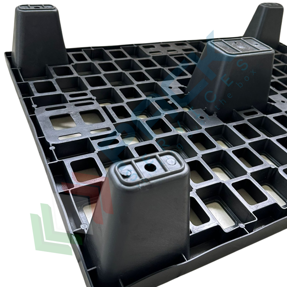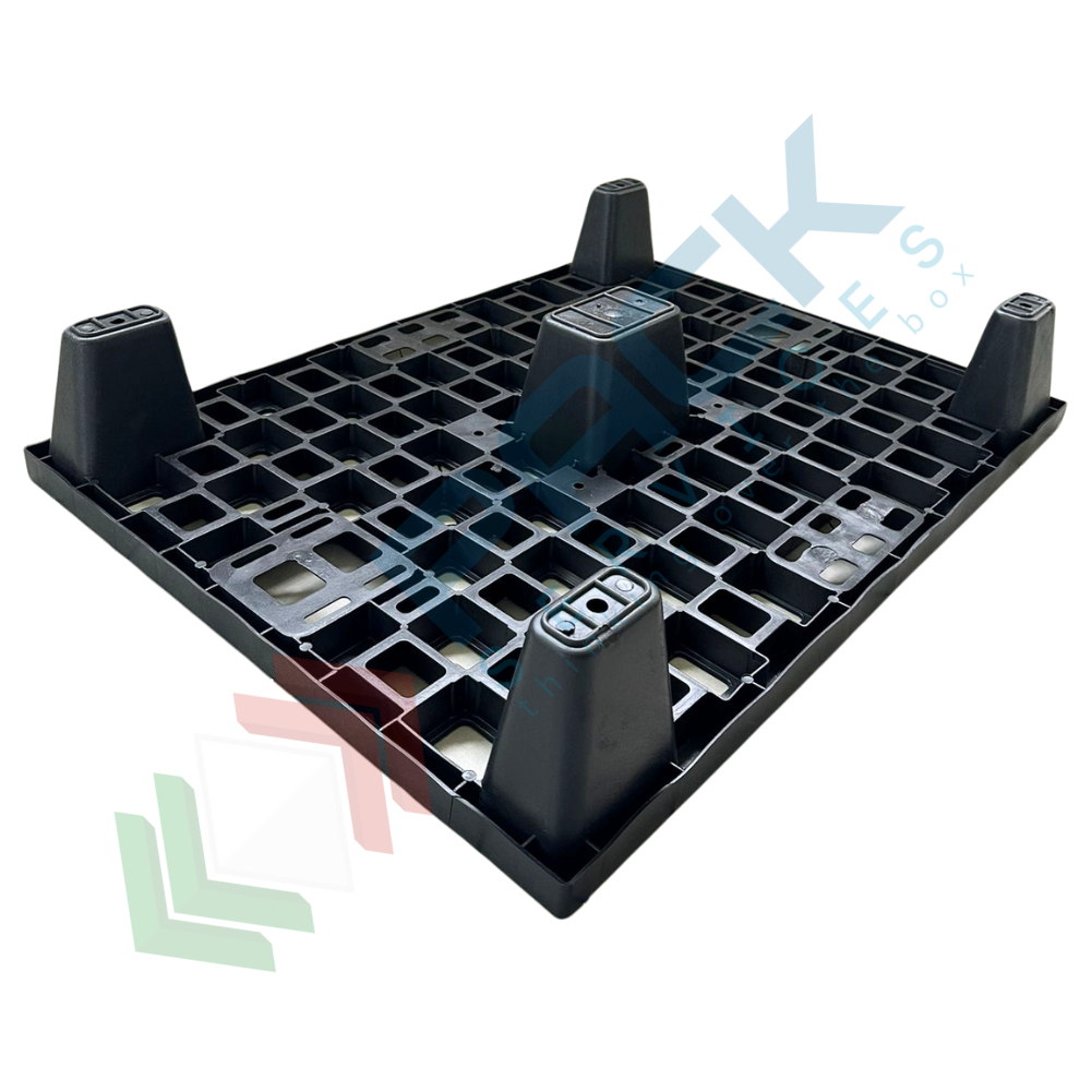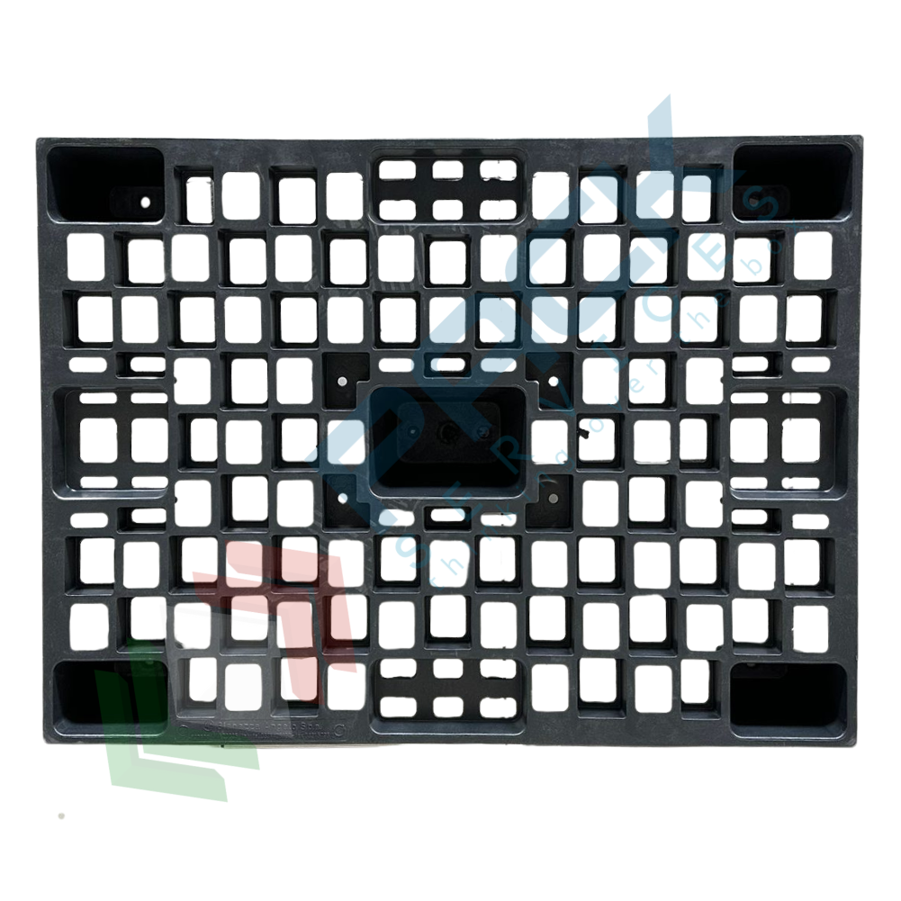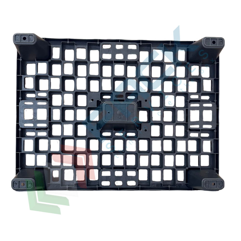 Bancale in plastica riciclata (PP), Mis. 600 L x 800 P x 140 H mm, base di appoggio 5 piedi, portata dinamica 500 Kg, portata statica 1100 Kg, piano superiore forato. Pallet in plastica leggera, inseribile per un risparmio notevole di spazio, soprattutto in fase di stoccaggio, con elevata capacità di carico. Non richiede alcuna manutenzione particolare, esente da danneggiamento per intemperie ed umidità, resistente alle alte e basse temperature. Il bancale di plastica è maneggevole, può essere inforcato da tutti e 4 i lati con traspallet o carrello elevatore. Colore grigio/nero. Pallet plastica NON idoneo al contatto alimentare.