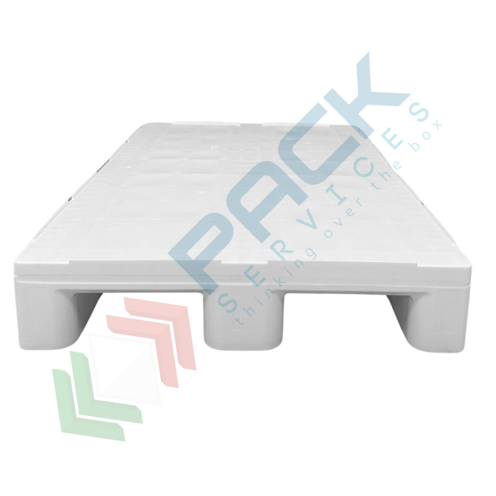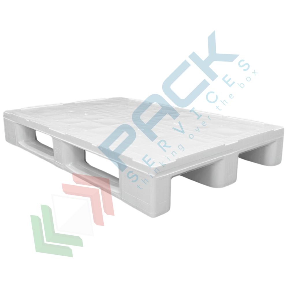 Bancale in plastica (HDPE), Mis. 800 L x 1200 P x 165 H mm, base di appoggio 3 traverse, portata dinamica 1500 Kg, portata statica 5000 Kg, portata su scaffale 500 Kg, piano superiore chiuso, con bordo. Pallet in plastica con elevata capacità di carico, realizzato in materiale completamente riciclabile, di prima fusione garantito e certificato. Non richiede alcuna manutenzione particolare, esente da danneggiamento per intemperie ed umidità, resistente alle alte e basse temperature. Il bancale di plastica è maneggevole, può essere inforcato con traspallet o carrello elevatore. Pedana ideale per la logistica, lo stoccaggio e la movimentazione, utilizzata sia nell'industria leggera che in quella pesante. Colore bianco. Pallet plastica idoneo al contatto alimentare. Pedana utilizzata nell'industria delle carni, nell'industria chimica ed in quella farmaceutica.
