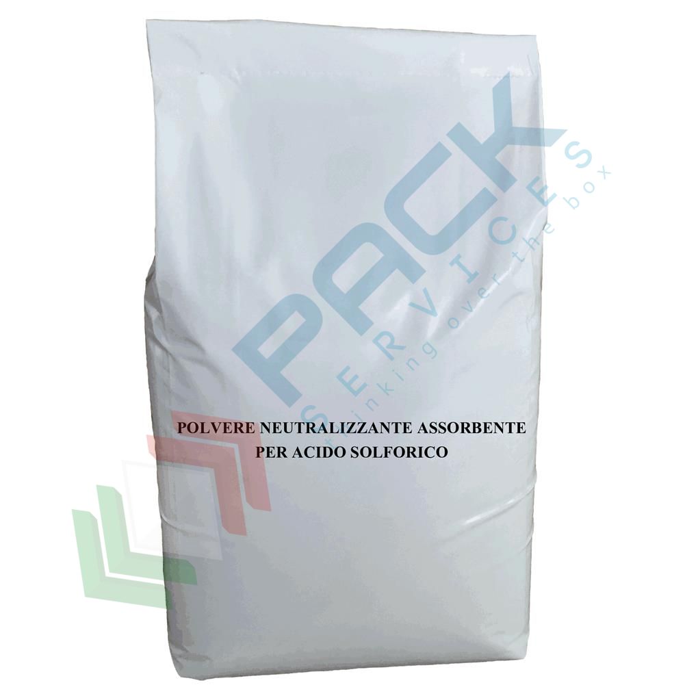 Neutralizzatore assorbente per acido solforico, sacco da 20 Kg. Rapporto di assorbenza 0,54 Kg per 1 Lt di acido solforico, rapporto di neutralizzazione 0,54 Kg per 1 Lt di acido solforico. Utlizzabile in tutti i locali dove sono presenti batterie di accumulatori al piombo e in particolare acidi. Prodotto specifico per lassorbenza e la neutralizzazione di acidi realizzato da una miscela di sabbie di origine naturale opportunamente calibrate per conferire al prodotto sia ottimi risultati di neutralizzazione ed assorbimento sia la completa non pericolosità e non tossicità per lambiente e per lutilizzatore. Certificazione di rispondenza eseguita dal Politecnico di Torino Rapporto di prova n. 13/14/2012. Prodotto ecocompatibile, a differenza dei prodotti irritanti, non è necessario stoccarli in contenitori particolari a tenuta stagna.