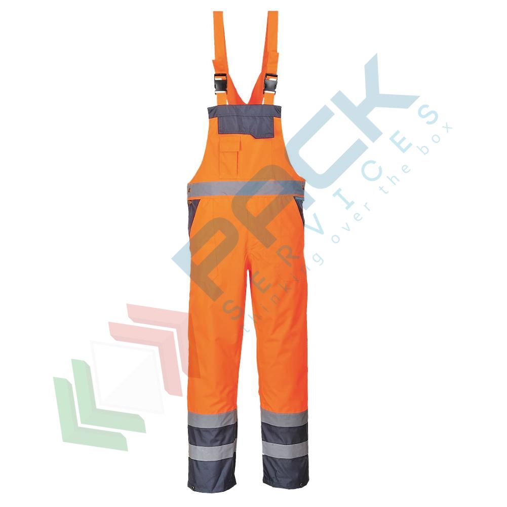 Salopette alta visibilità impermeabile 100% poliestere finitura antimacchia, doppio rivestimento in PU, 190 gr, certificata EN ISO 20471 Classe 2 + RIS 3279 TOM + EN 343, colore arancione/blu navy, tg. S