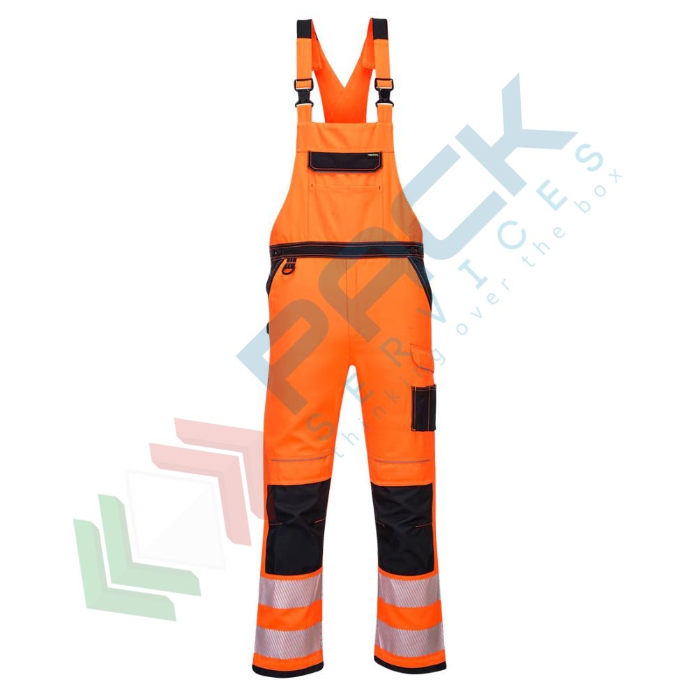 Salopette alta visibilità in Titanmill Plus (65% poliestere + 35% cotone) 300 gr, banda riflettente HiVisTex Pro leggera e flessibile, 10 tasche ampie, certificata EN ISO 20471 Classe 2 + RIS 3279 TOM, colore arancione/nero, tg. L
